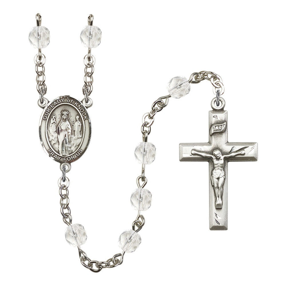 Silver Finish Rosary features 6mm Crystal Czech Fire Polished glass beads. The centerpiece features a O/L of Knock medal. Crystal is the birthstone color for April.