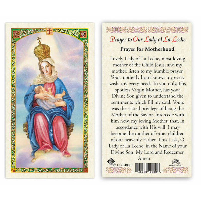 This lovely, full-color laminated prayer card features an attractive image of Our Lady of La Leche on the front and a moving prayer on the reverse. A beautiful devotional aid and a thoughtful gift, it's ideal for greeting cards, prayer groups, or daily use. The card, made in Italy, is perfect for nursing mothers and motherhood, measuring 2.5" x 4.2".