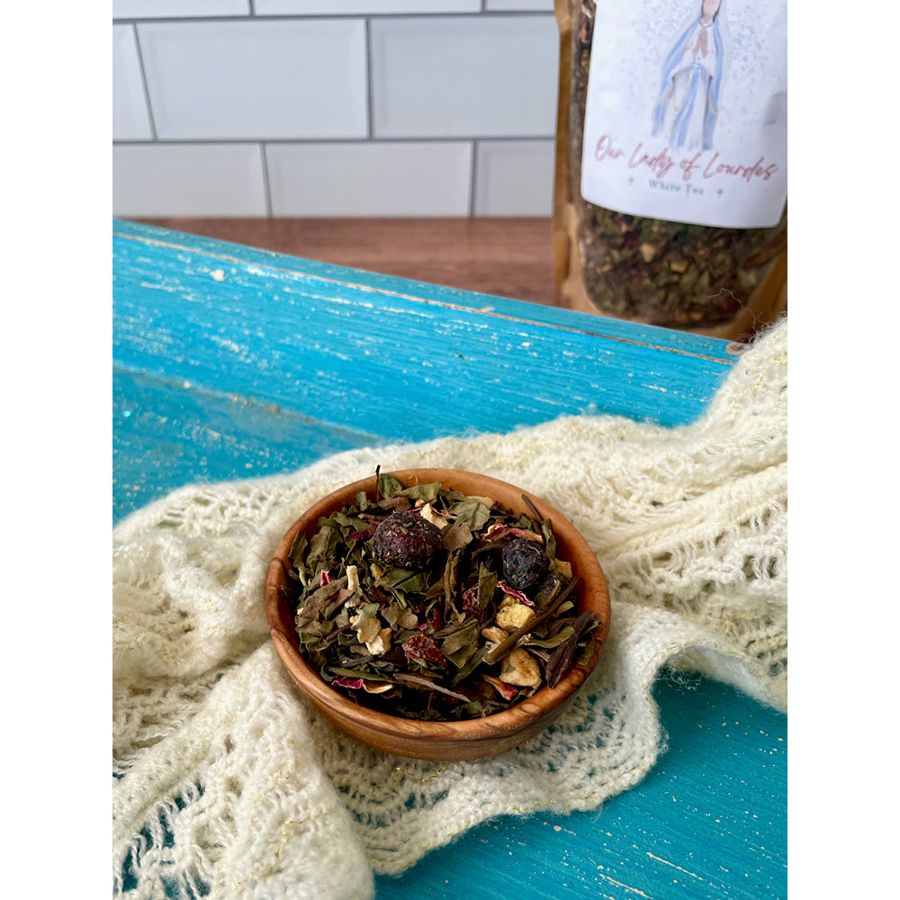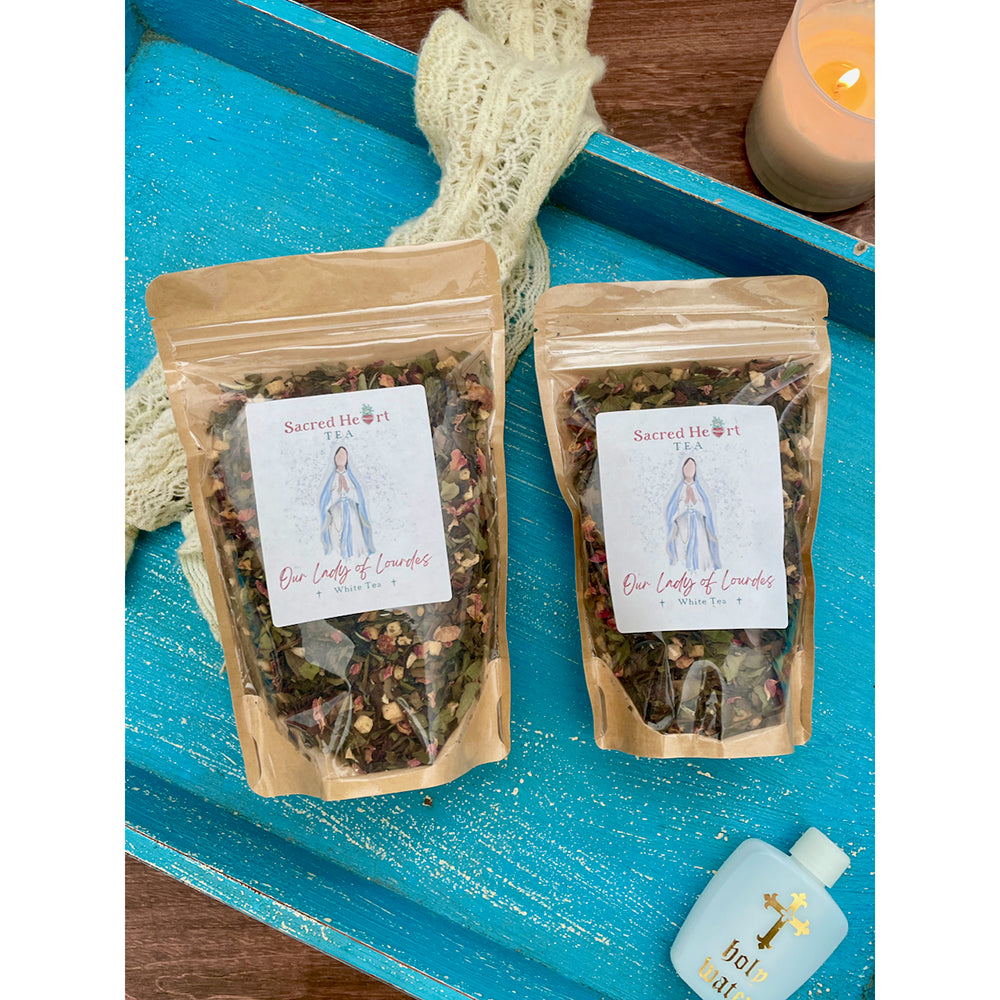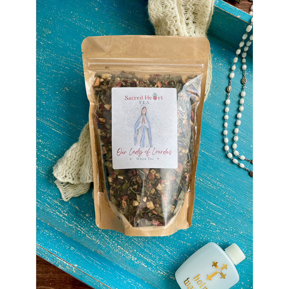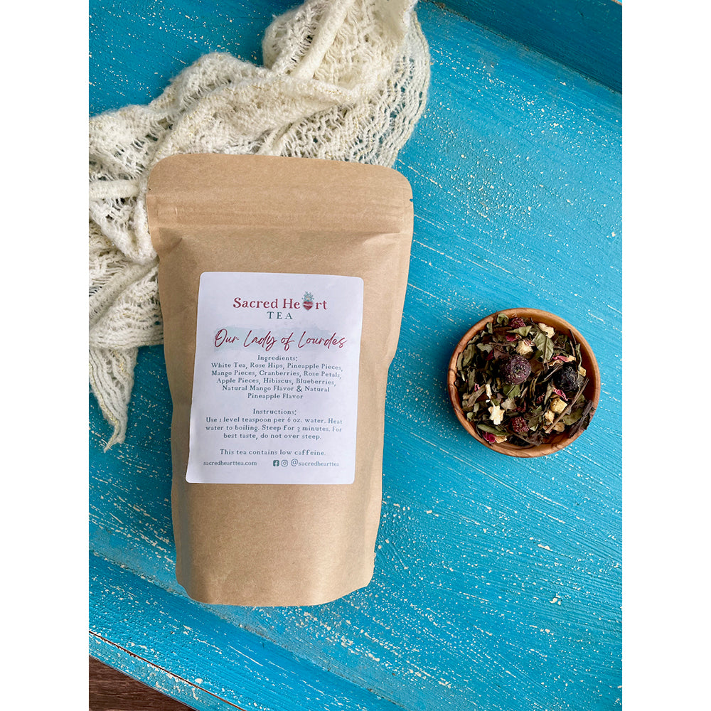 Our Lady of Lourdes Spring Fruit White Tea is a delightful loose leaf blend that offers comfort, strength, and peace. Featuring fruits and roses, this tea is a reflection of Our Lady's sweetness and motherly love. Available in 2 oz. or 4 oz. bags, it provides a soothing experience perfect for those seeking encouragement or healing. High in caffeine, it makes an ideal gift when paired with a mug or tumbler. Made in the USA.