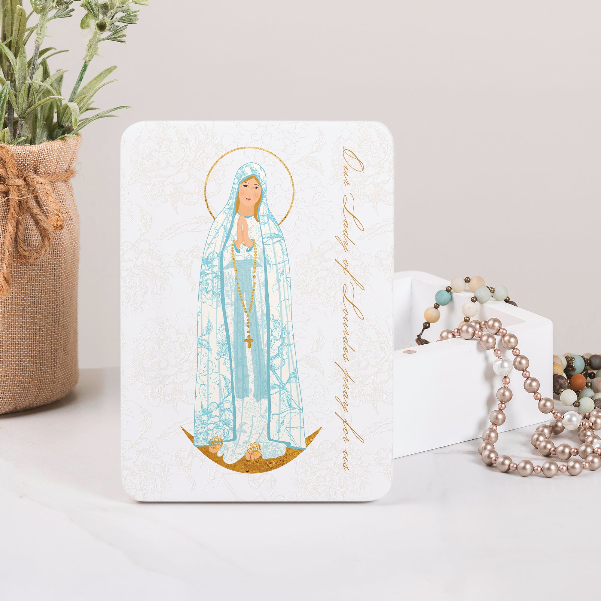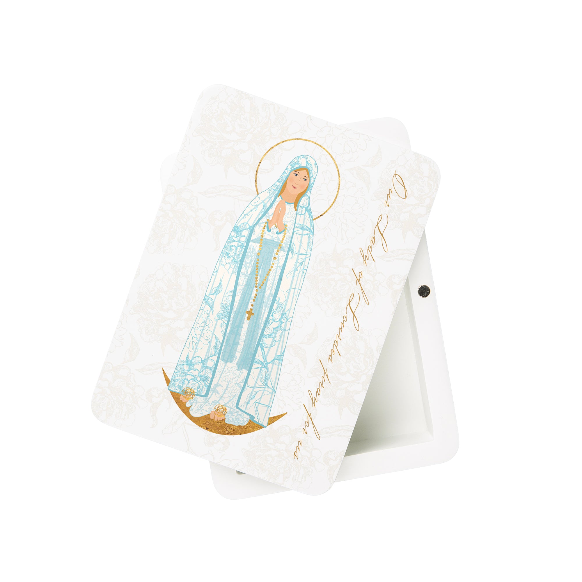 The smooth white box features a removeable magnetic lid containing a serenely colored image of Our Lady of Lourdes in beautiful tones.