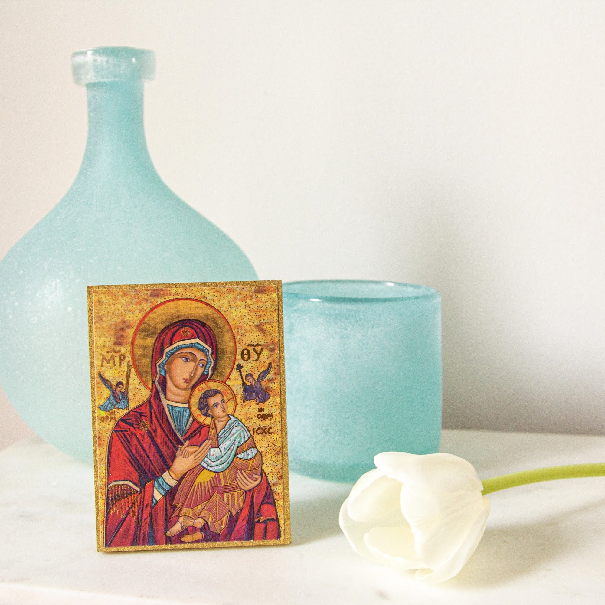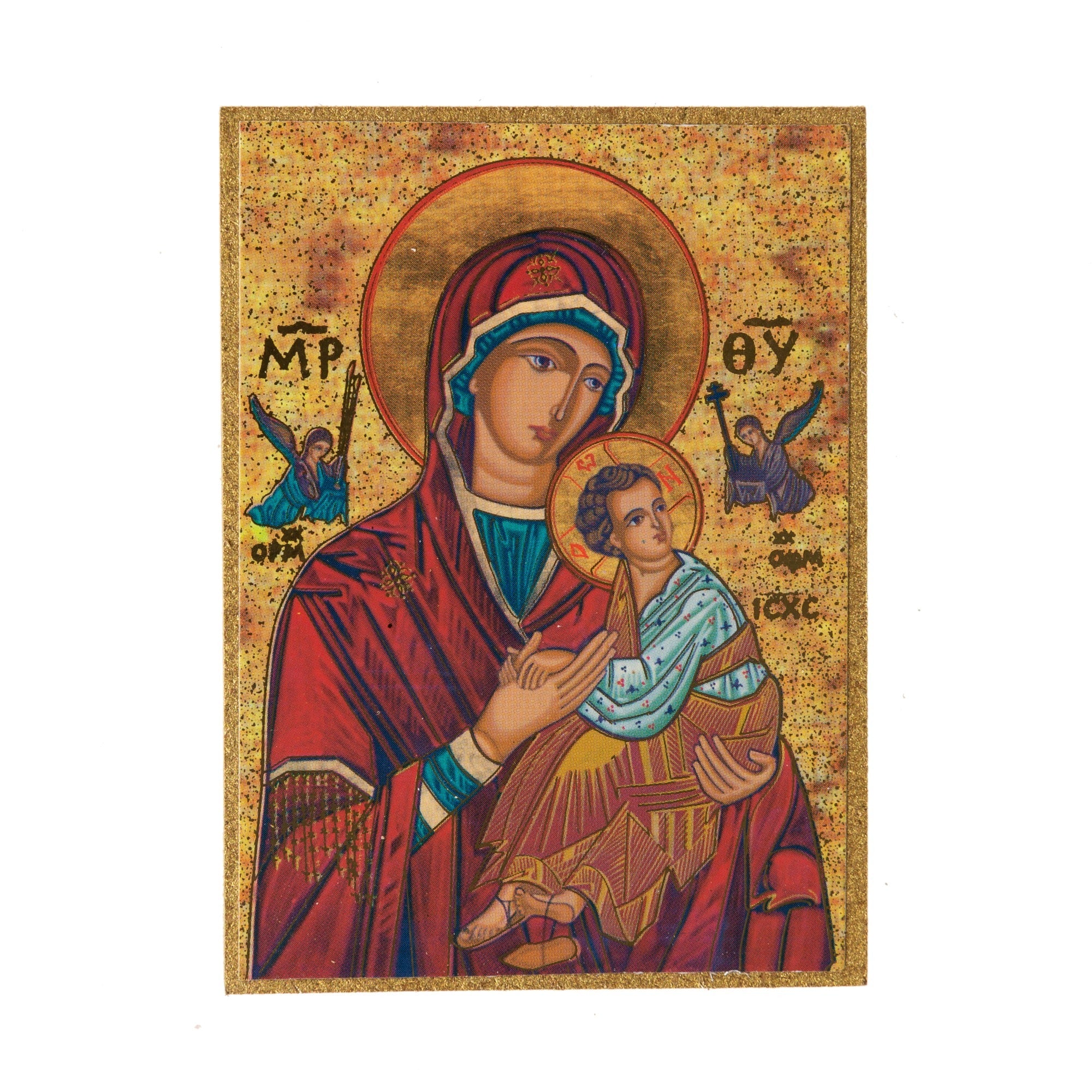 This Italian Miniature Icon of Our Lady of Perpetual Help is crafted in the traditional style by skilled artisans, featuring bold red and gold hues on wood. Perfect for prayer and meditation, its small size fits any space, making it an ideal gift for those devoted to seeking encouragement and comfort from Our Lady. Made in Italy.