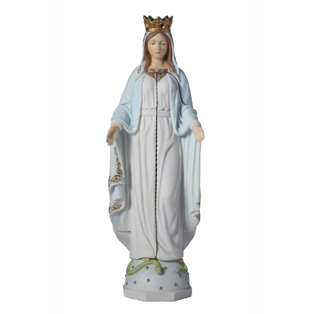 On either side of this central image are depictions of the Immaculate Heart of Mary and the Sacred Heart of Jesus, reminding us of their united love and suffering for the salvation of the world. When closed, the statue stands as a serene and elegant figure of Mary in quiet prayer.
