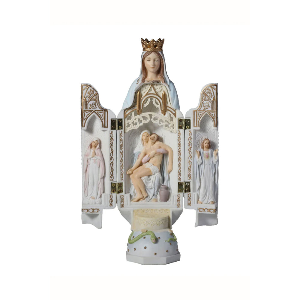 This graceful and tender triptych statue of Our Lady is both a beautiful piece of art and a powerful invitation to prayer. Crafted in soft pastel tones, the statue opens at the center to reveal a moving scene from the Passion—the Blessed Mother cradling the body of Christ after His crucifixion, evoking the sorrow and love of the Pietà.