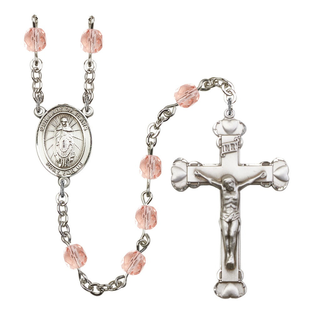 Silver Finish Rosary features 6mm Pink Czech Fire Polished glass beads. The centerpiece features a O/L of Tears medal. Pink is the birthstone color for October.