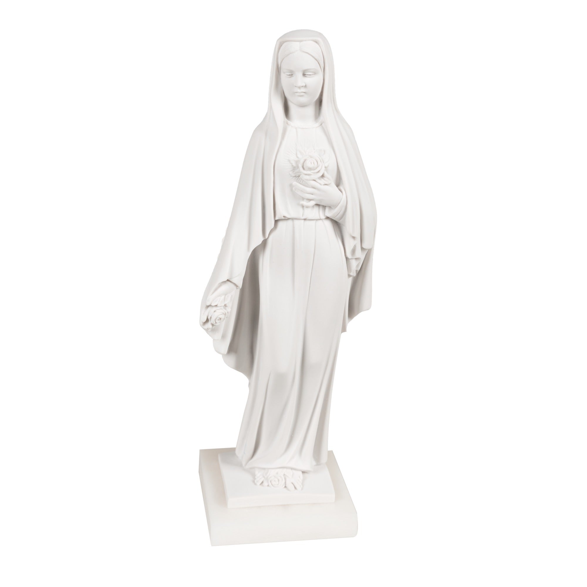 Our Lady of the Roses stands gracefully with her hand on her heart, clutching a rose in this beautiful, Italian alabaster statue. This is a distinctive and graceful addition to your home to honor Mary and ask her blessing on your family. It will make a wonderful addition to your sacred space.