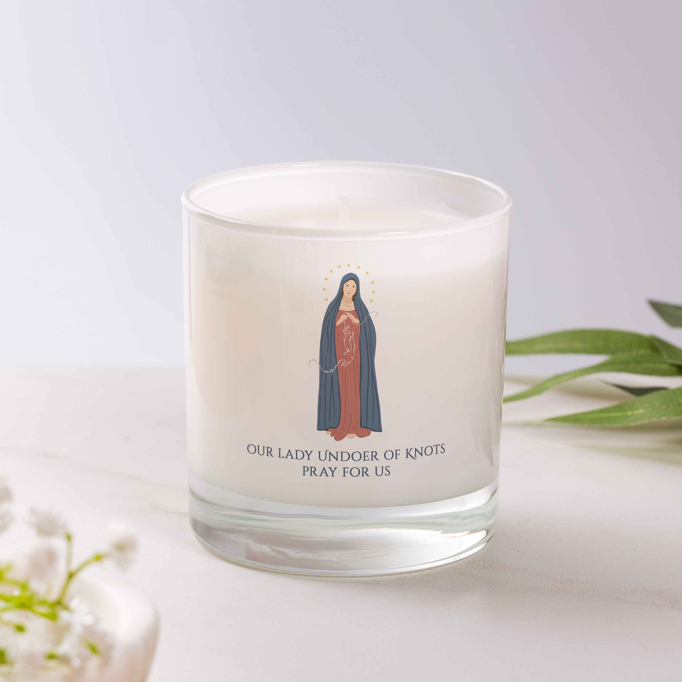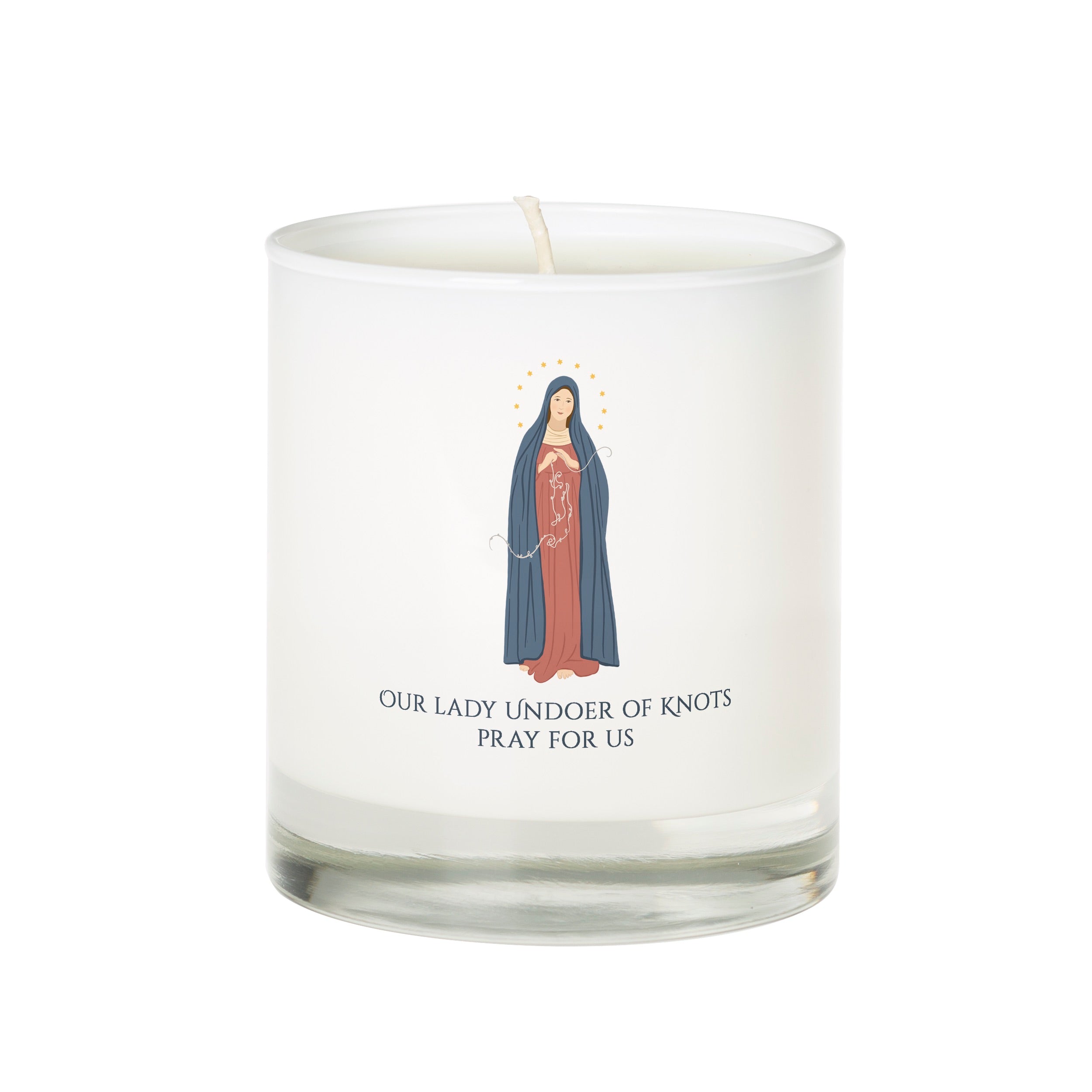 Enhance your sacred space with the Our Lady Undoer of Knots Candle, exclusively from The Catholic Company. This 11 oz. white glass scented candle features a charming image of Our Lady and delivers a fresh Grace scent combining lemon, lime, jasmine, and more. Ideal for prayer or relaxation, it offers 90 hours of burn time and makes a thoughtful gift for anyone seeking hope and Mary's protection.