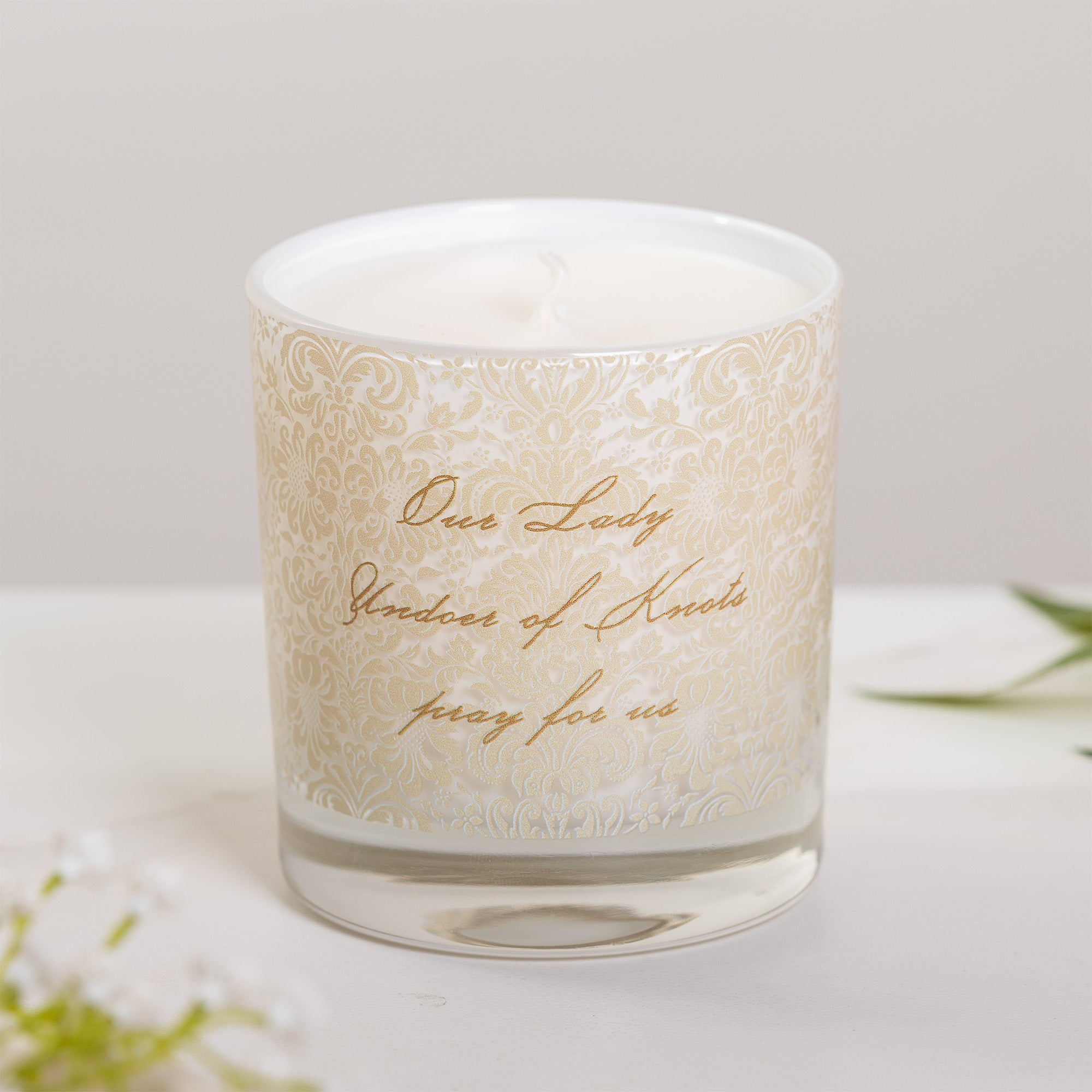 Enhance your prayer space with the Our Lady Undoer of Knots Toile Candle, exclusively from The Catholic Company. This elegant candle features a detailed image of Our Lady and a gold-scripted invocation. With a refreshing aroma of lemon, lime, jasmine, and cotton blossom, it offers a 90-hour burn time. Perfect as a prayer aid and thoughtful gift.