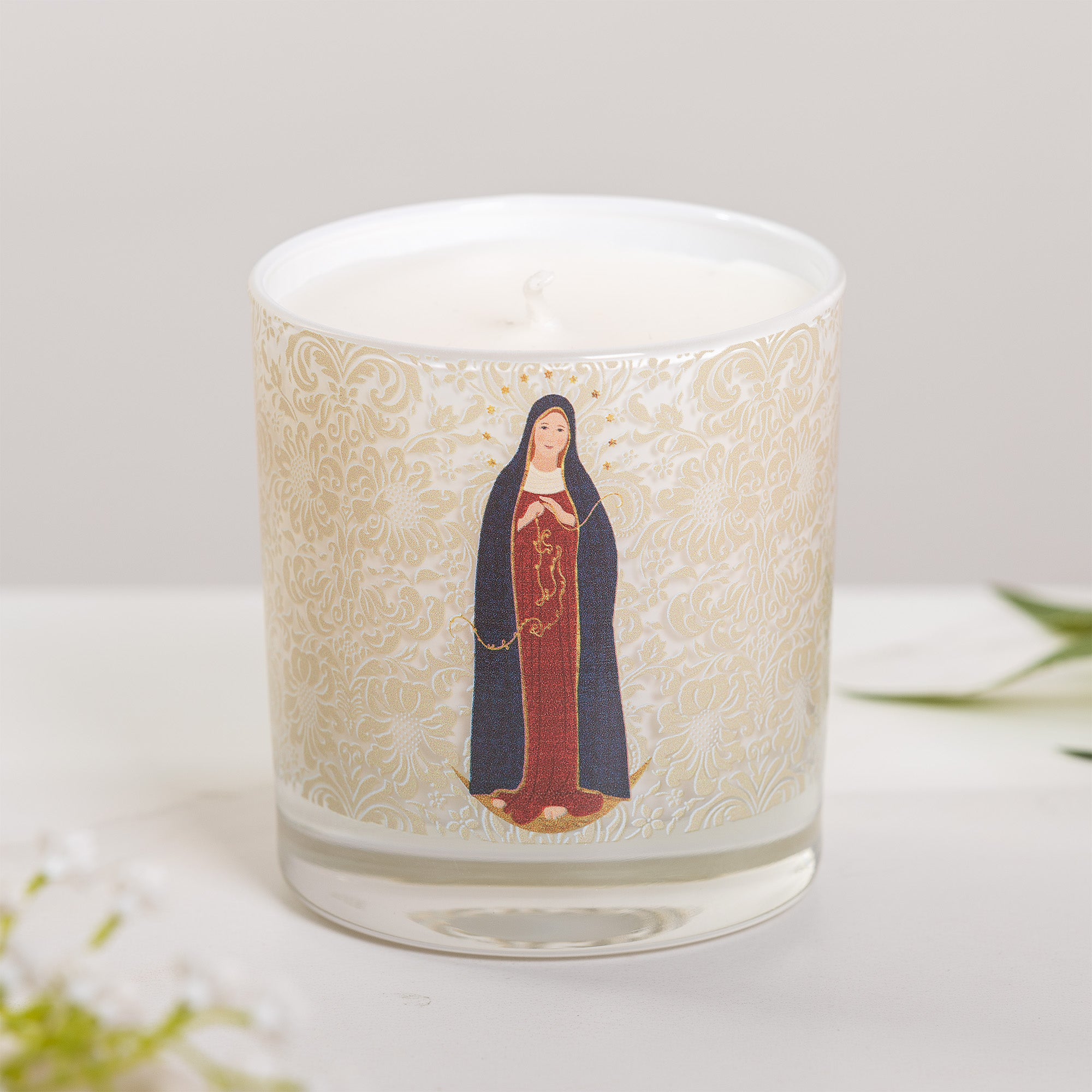 The white candle is presented in a glass jar. A charming image of Our Lady, set against an intricate and delicate toile background, graces the front of the candle. On the back, an invocation for Mary to Pray for us, scripted exquisitely in gold, brings Mary's motherly promises and protection to you, your family, your home, and our world.