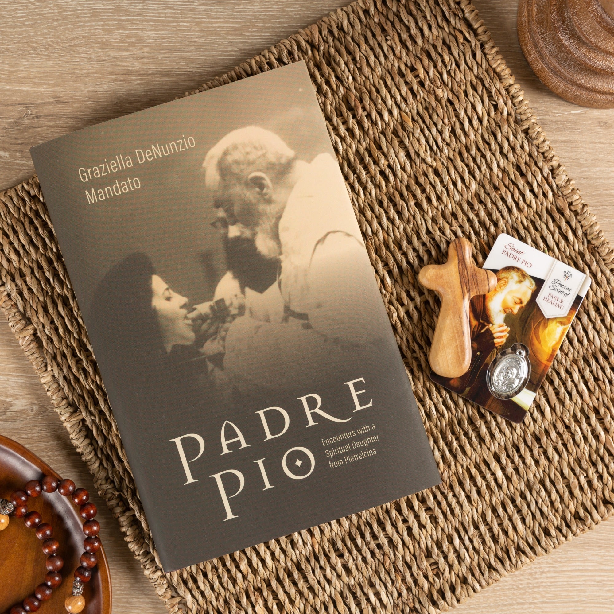 The Padre Pio Gift Set offers a heartfelt journey into the life of Padre Pio, featuring "Encounters With a Spiritual Daughter From Pietrelcina," a memoir by Graziella DeNunzio Mandato exploring her profound experiences with the saint. The set includes a comforting palm cross and healing prayer card, making it a perfect gift for anyone seeking solace and spiritual guidance.