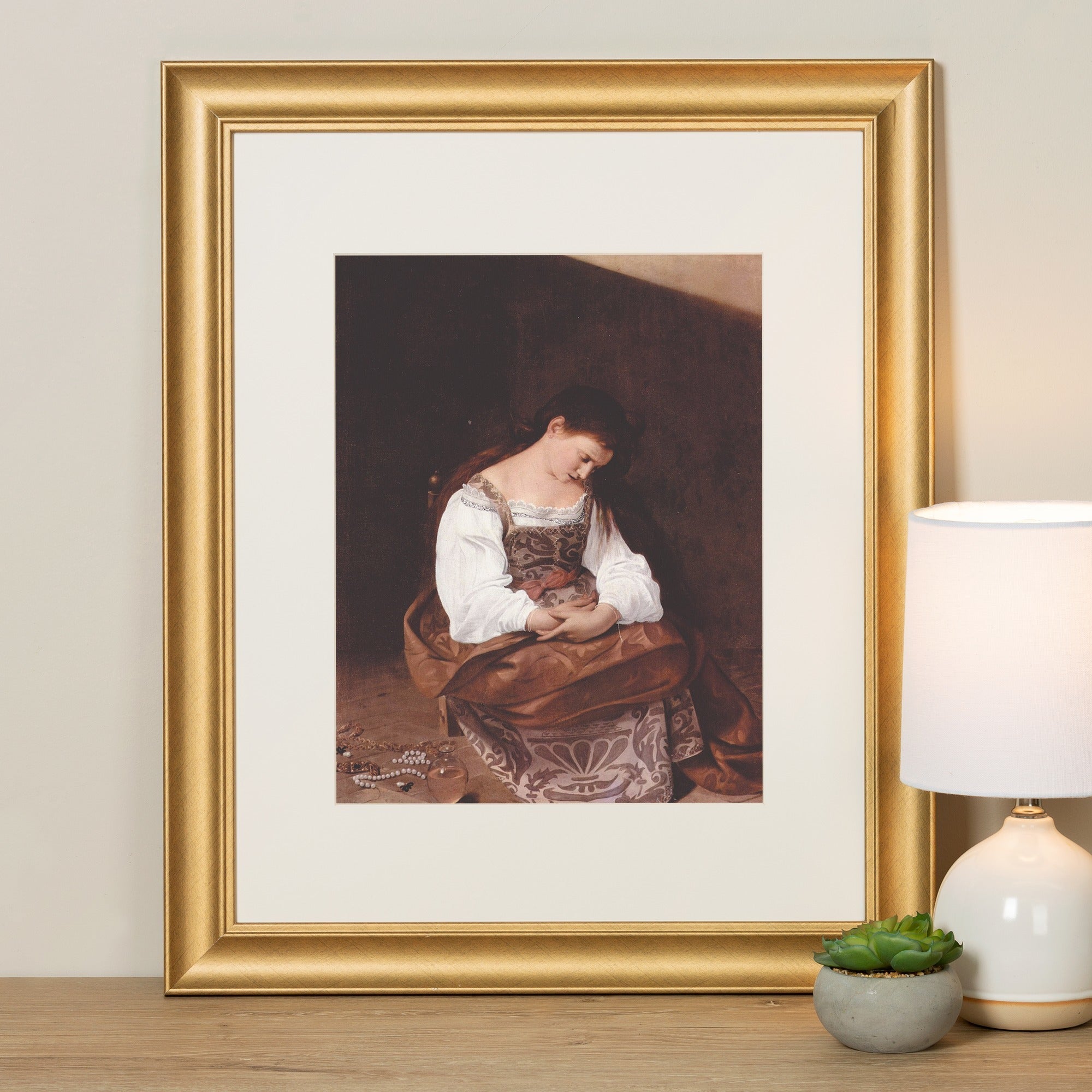 The "Penitent Magdalene Framed Print" showcases Caravaggio's renowned painting of Mary Magdalene, capturing her transformation to a life with Christ. This traditional piece serves as a compelling focal point in any room. Available in a 16" x 20" frame with an 11" x 14" print, choose from Natural Wood, Gold, or Black with Gold Braid frames to complement your decor. Exclusive to The Catholic Company.