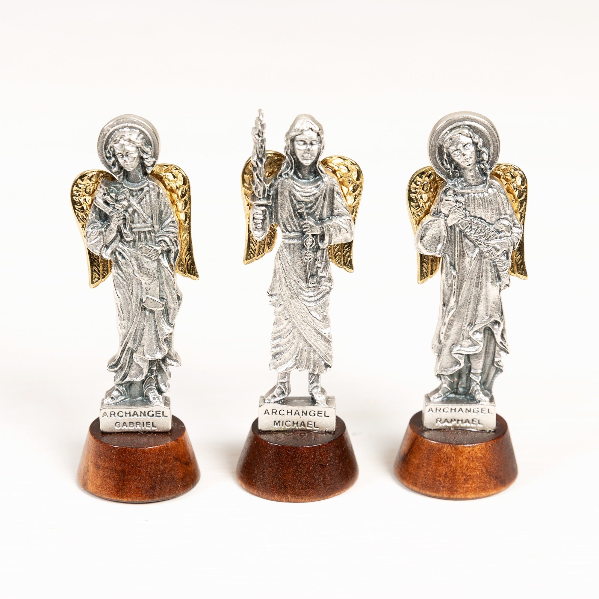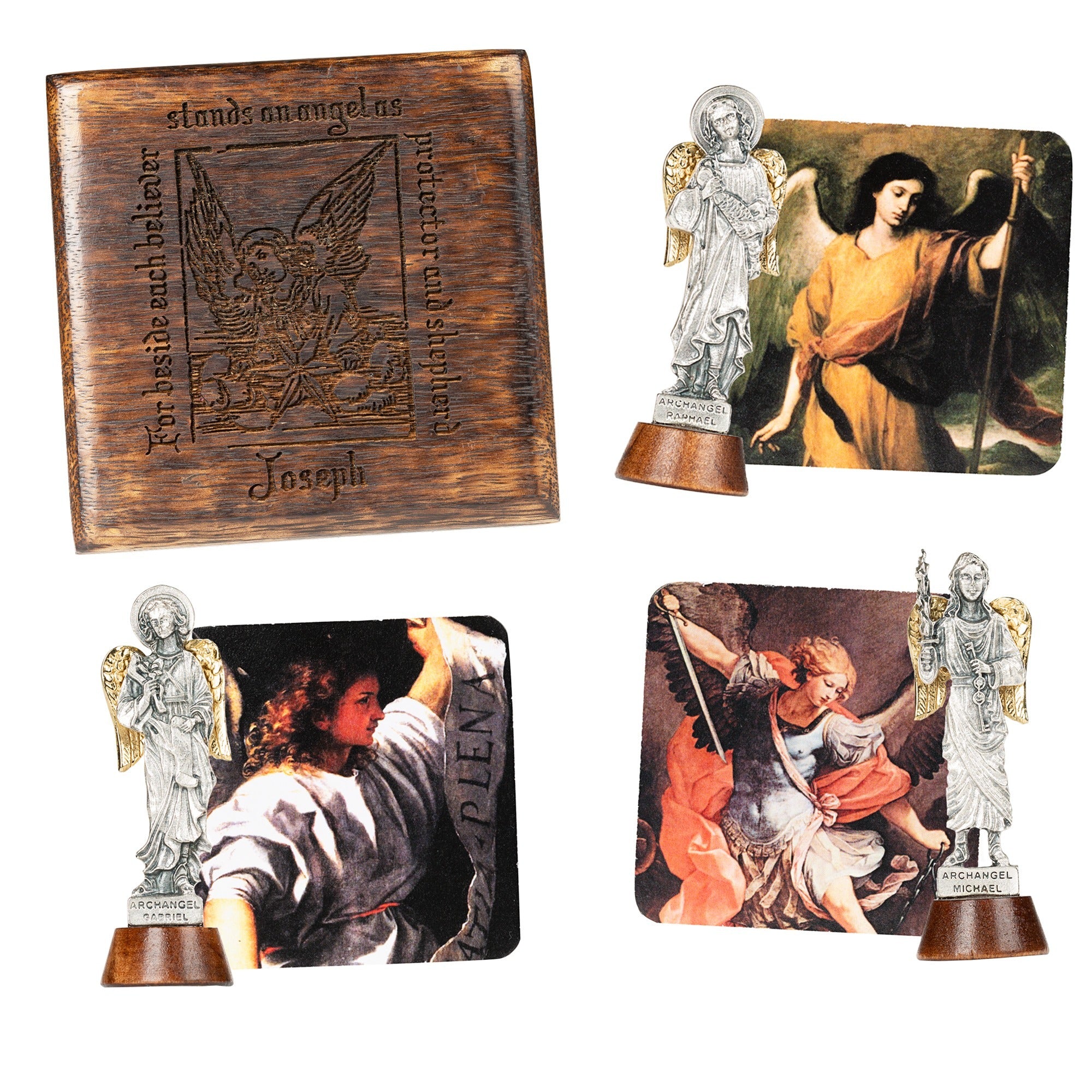 The Personalized Archangels Saint Box is a delightful gift set featuring three pewter angels on wooden stands and information cards in a mango wood box. Including archangels St. Michael, St. Gabriel, and St. Raphael, it offers powerful divine companionship. Personalize the box with a name for added significance. This exclusive set by The Catholic Company inspires faith and protection, making it perfect for all ages.