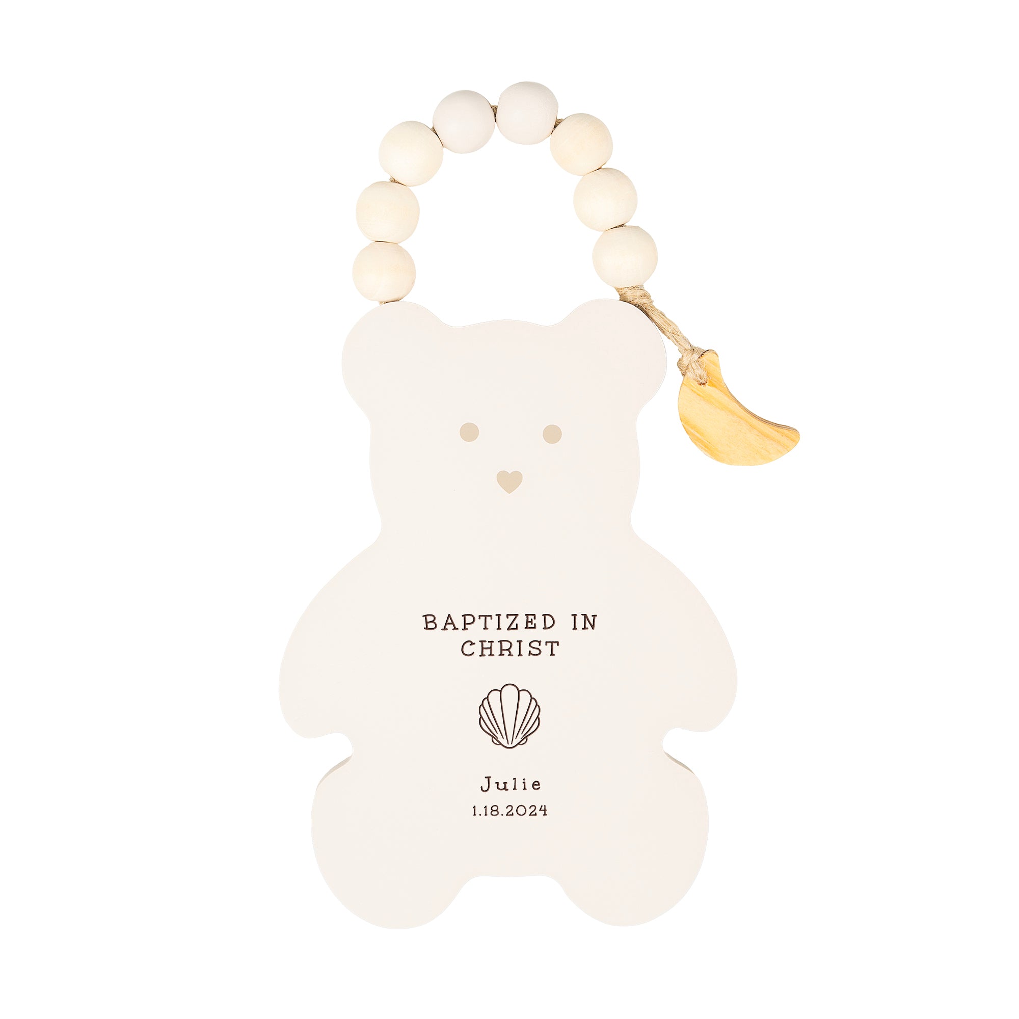 The Personalized Baptism Bear Hanging Plaque is a charming gift for a baby or child, featuring a serene bear design in soft sand tones. Personalized with the child's name and baptism date, it includes the message "Baptized in Christ" and a small scallop shell. Suspended by a jute cord with wooden beads and a moon-shaped charm, it's an ideal accent for a child's room. Dimensions: 4.4"W x 8"H.