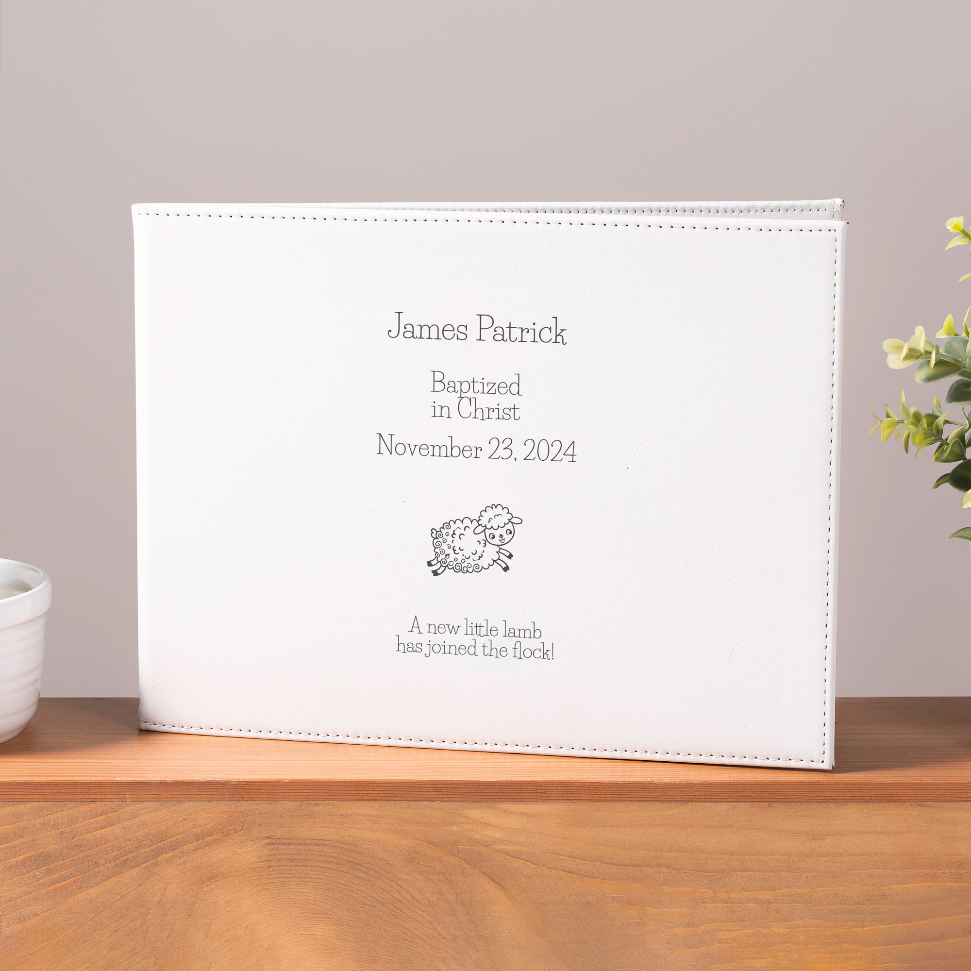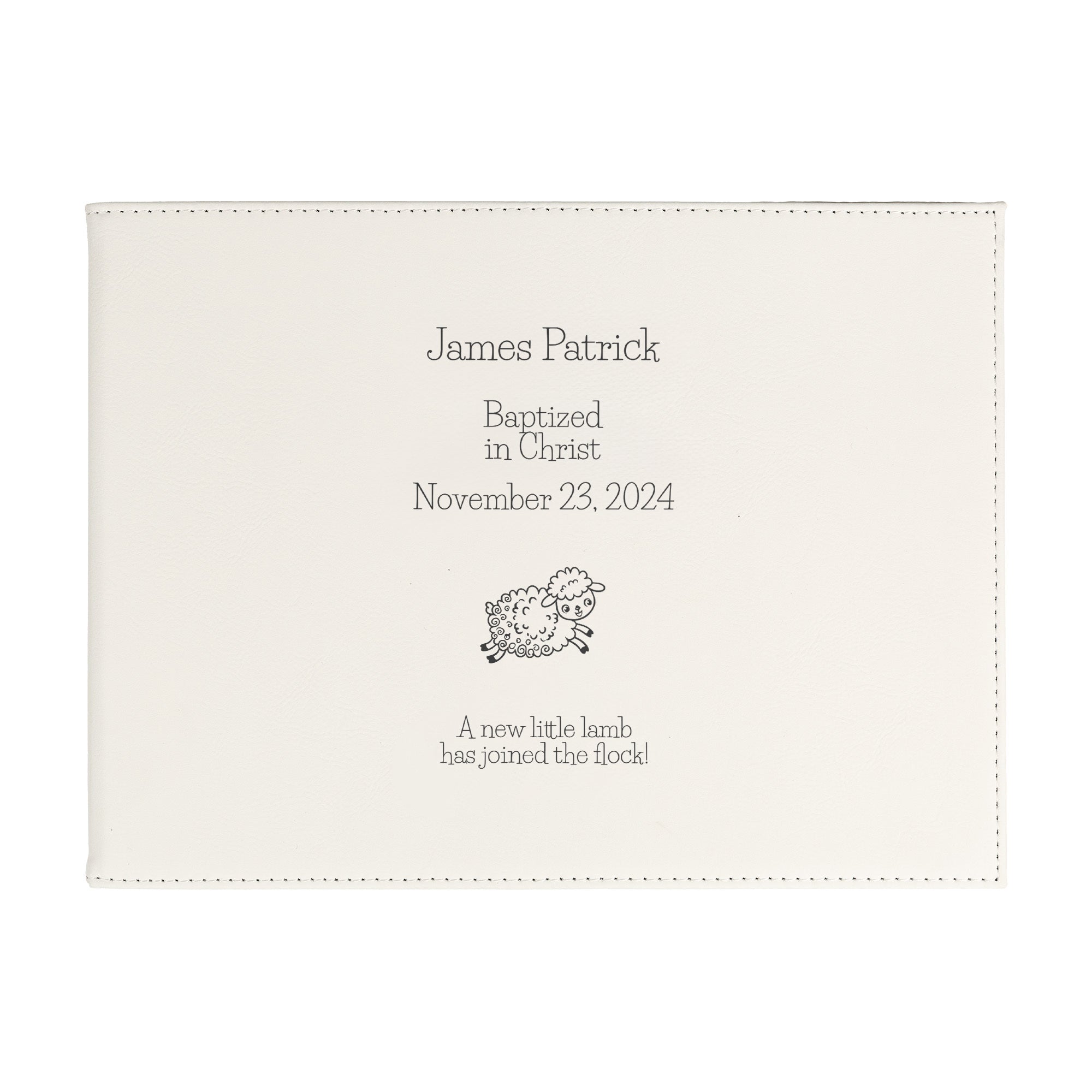 Add baby's name and Baptismal date, and we will add a precious little lamb and sweet sentiment reading, A new little lamb has joined the flock! Easily slide baby's Baptismal Certificate inside, behind the vinyl covered protector. A wonderful and personal gift, especially from a Godparent, or the perfect way to keep your Baptismal Certificate preserved so it becomes a family heirloom.