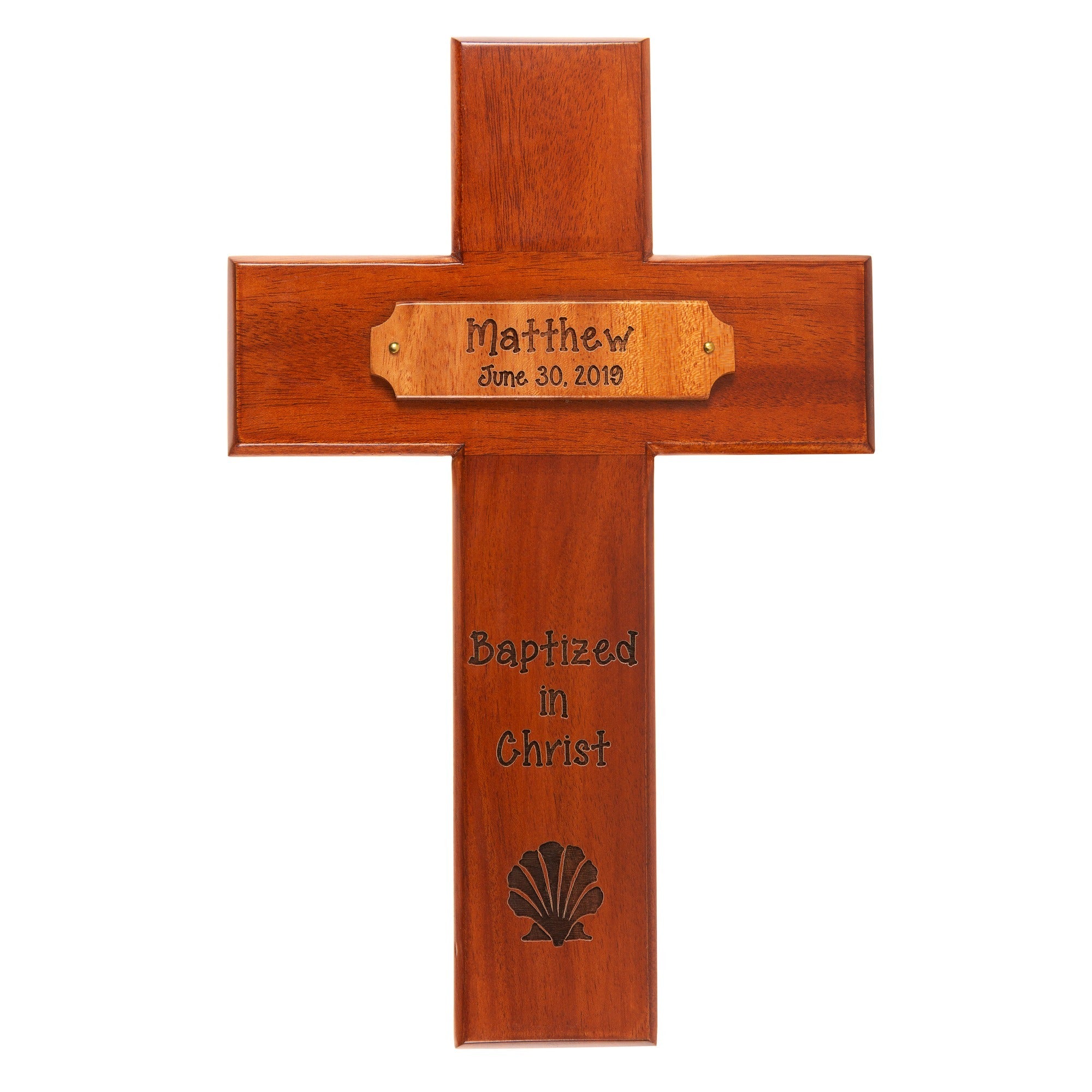 This two tone wooden cross features an engraving of a shell, symbolic of the pouring of water at Baptism. A heartfelt piece for parents to hang in a nursery, or a thoughtful, unique gift for godparents. The personalized plaque fits a name and date of Baptism, and makes a memorable keepsake for years to come. Designed and produced exclusively at The Catholic Company.