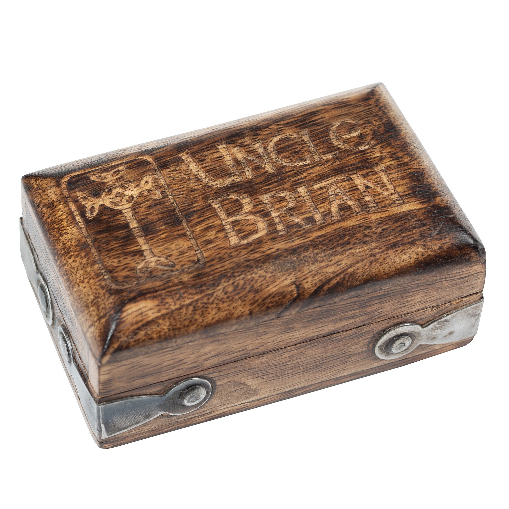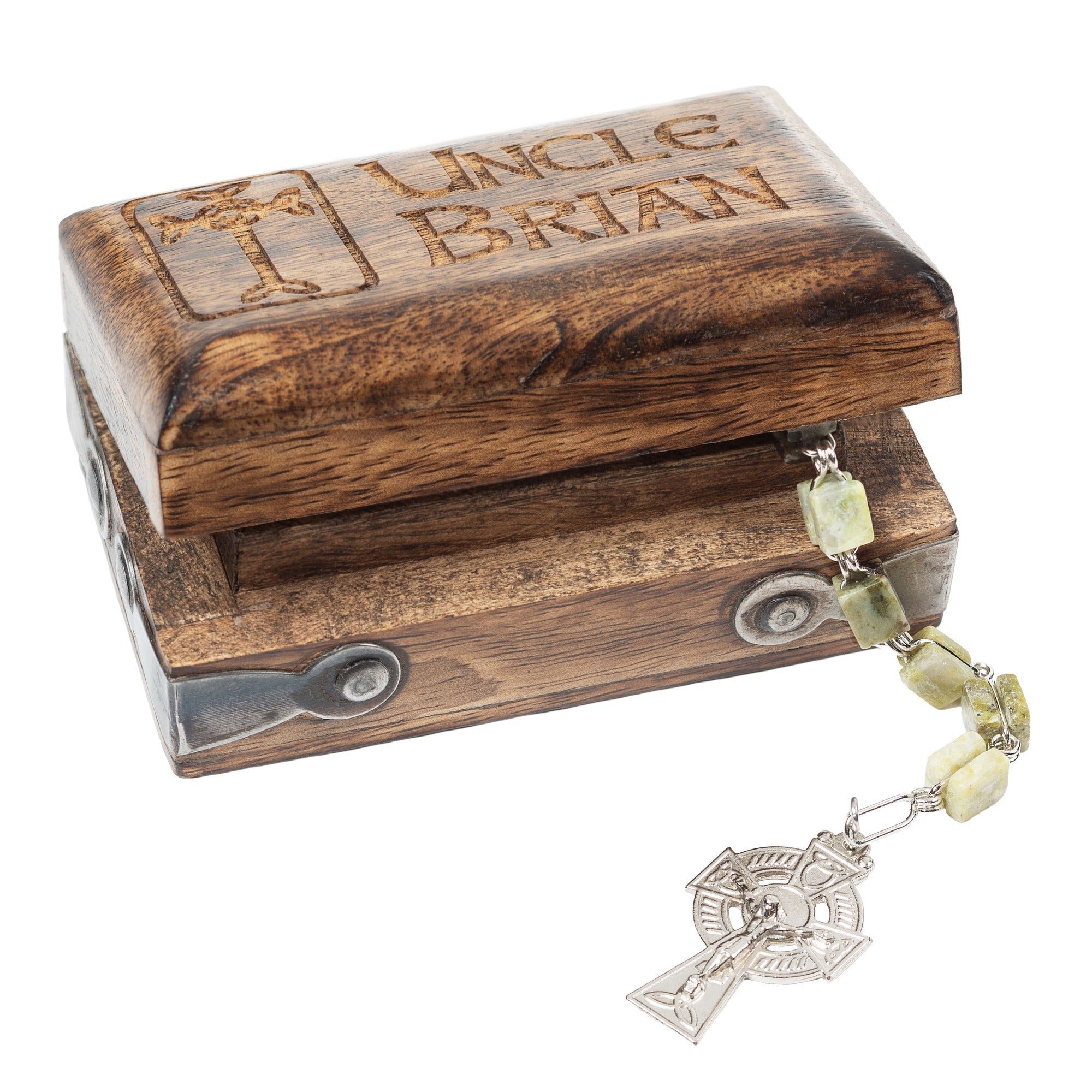 This personalized gift set is seeped in Irish tradition and love. The petite mango wood box features a tastefully engraved Celtic Cross of St. Patrick along with antiqued hardware and hinges adding to its old-world charm. Inside the personalized box is the single-decade rosary used in Ireland called the "An Paidrin Beag" meaning “The Little Rosary” (used in Penal days when it was forbidden to practice the Catholic faith in Ireland). With its beads of Connemara Marble, found only in West Ireland, this little rosary makes a big impression.