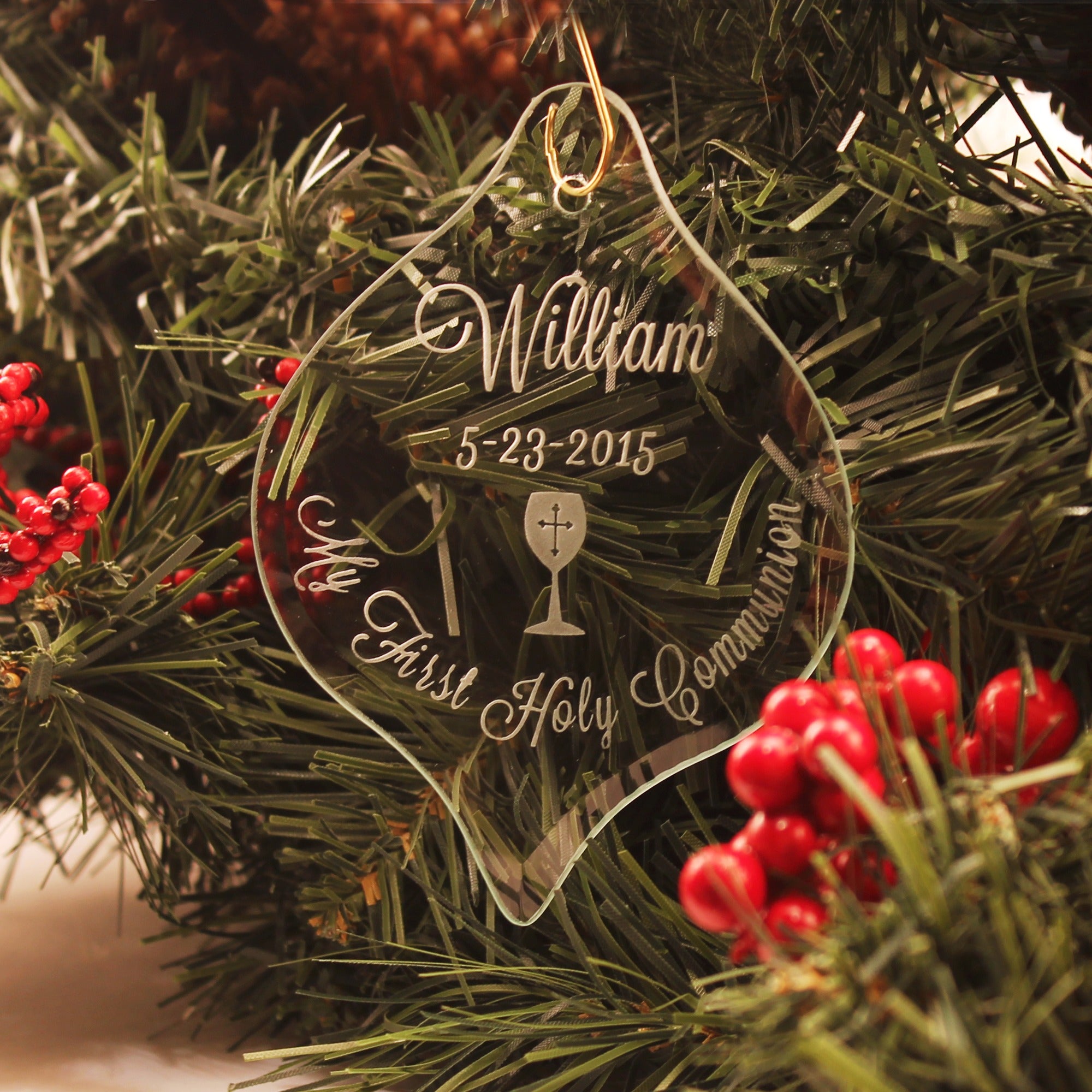 Our handmade glass "My First Holy Communion" ornament is the perfect addition to any Christmas tree. Reflecting light beautifully, the exclusive design features a hand sand-carved chalice with cross along with a personalized name and date. A unique keepsake ornament that recalls the Sacrament of Holy Communion and one's union with Christ.