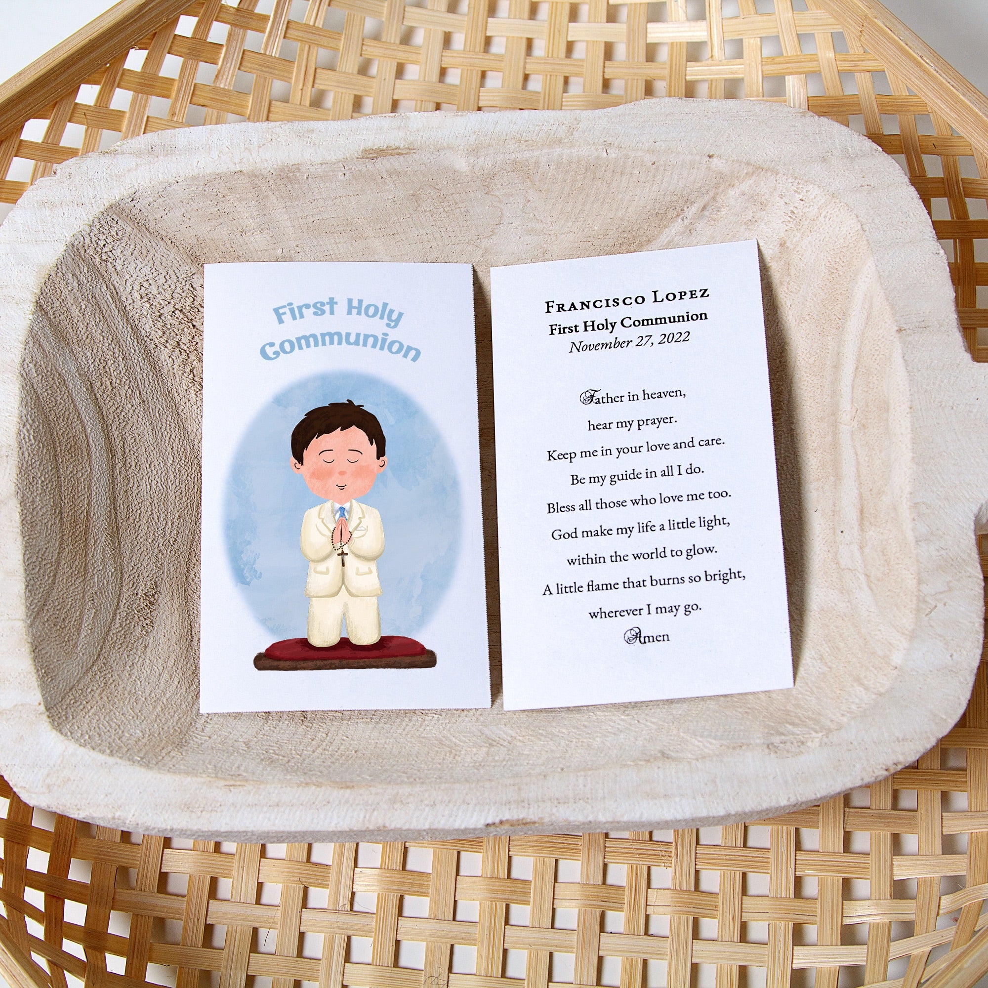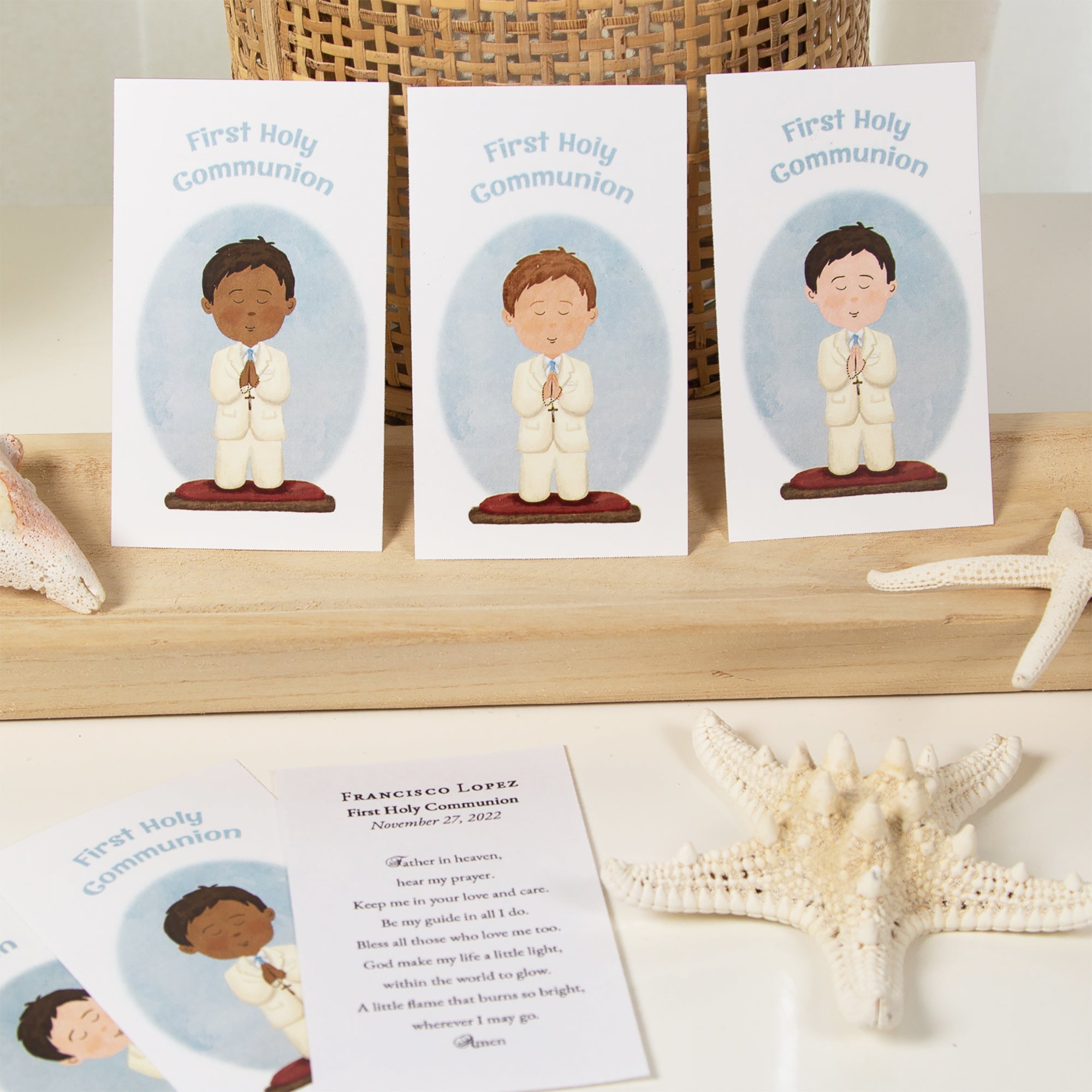 Celebrate a young boy's First Communion with our exclusive All God's Children Personalized First Communion Prayer Card and Candle. Designed by The Catholic Company, these cherished keepsakes feature a cheerful image of Jesus with a First Communicant. Perfect for a nightstand or prayer book, they serve as a lasting reminder of the sacred day he received the Holy Eucharist. Ideal gift for sons, grandsons, or nephews.