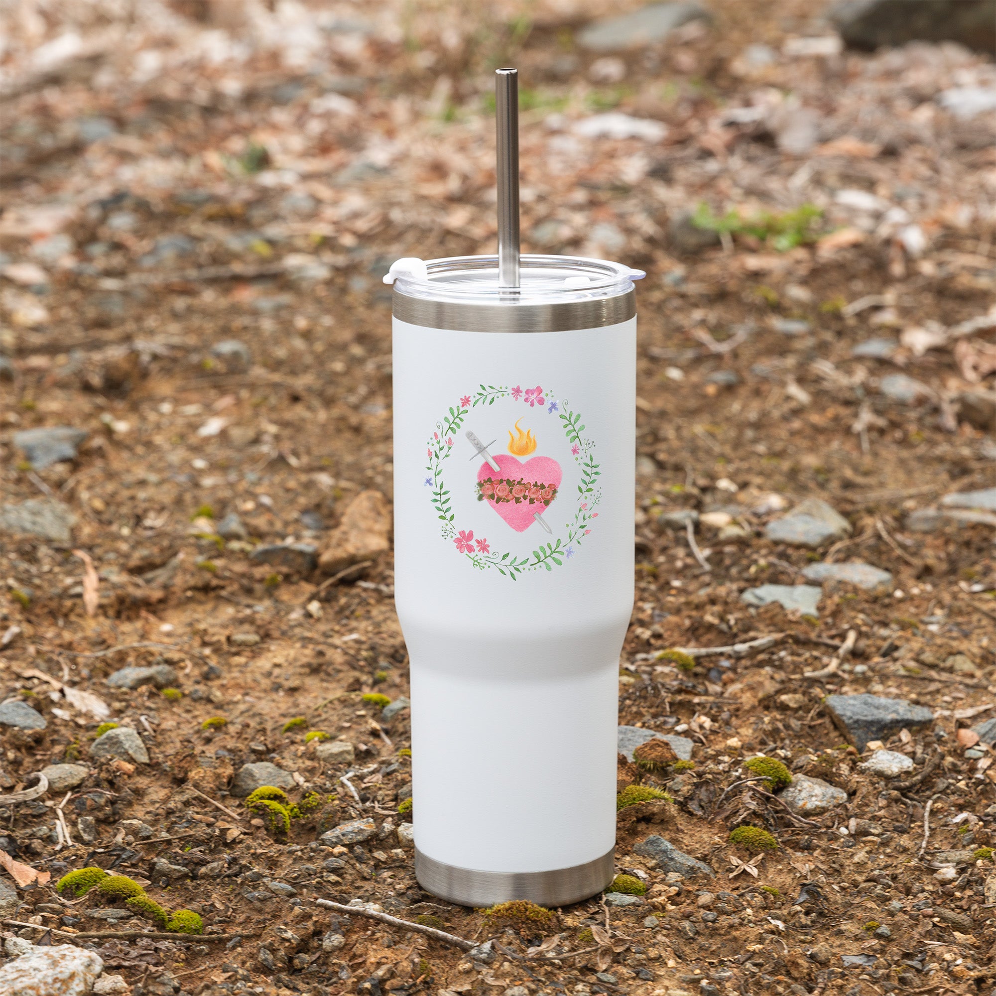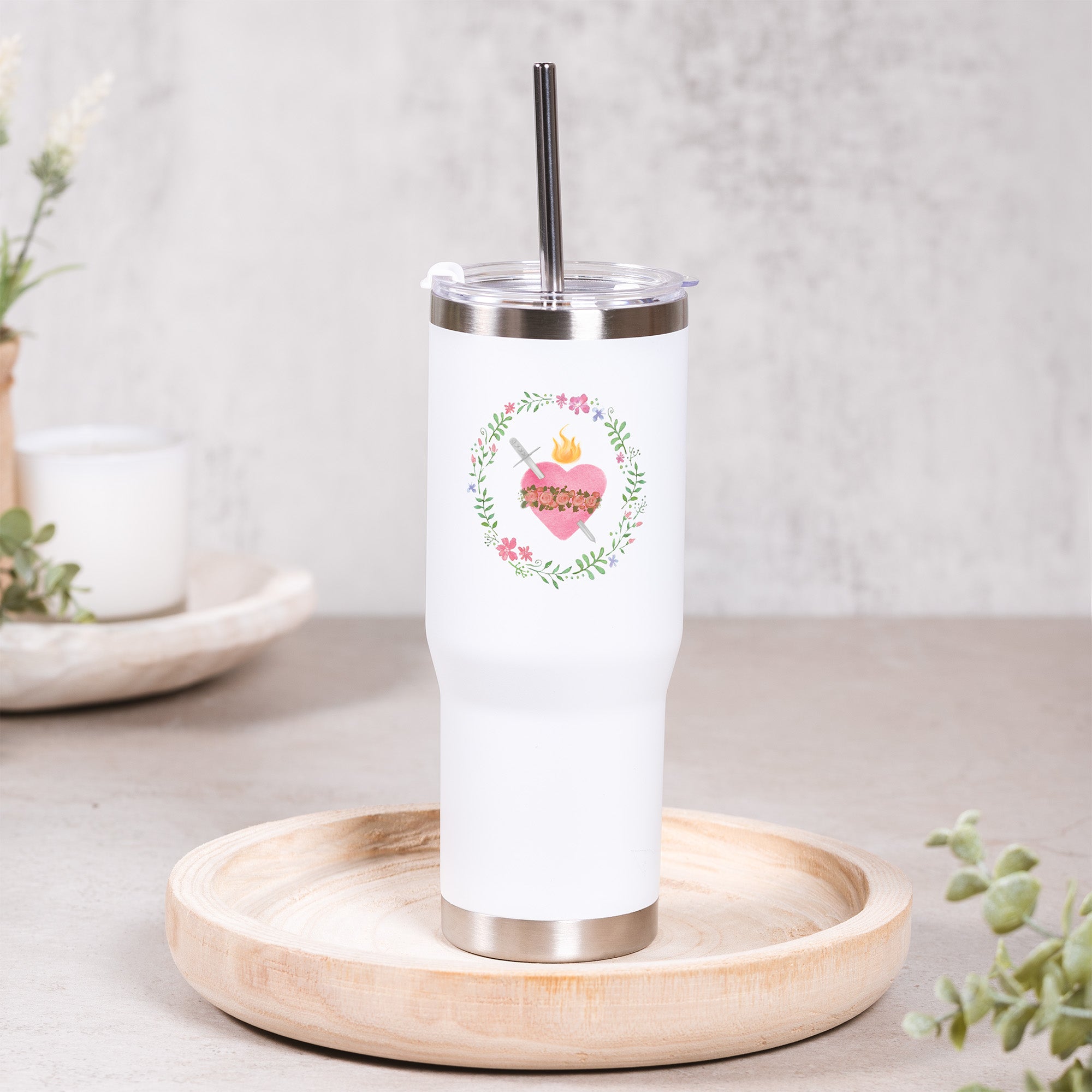 Stay hydrated and inspired with the Personalized Immaculate Heart Tumbler, featuring exclusive floral imagery of the Immaculate Heart on a white double-walled stainless steel tumbler. Add a personal touch with a custom monogram, making it a meaningful devotional gift. Designed by The Catholic Company, this 30 oz. tumbler is ideal for both busy days and quiet moments.