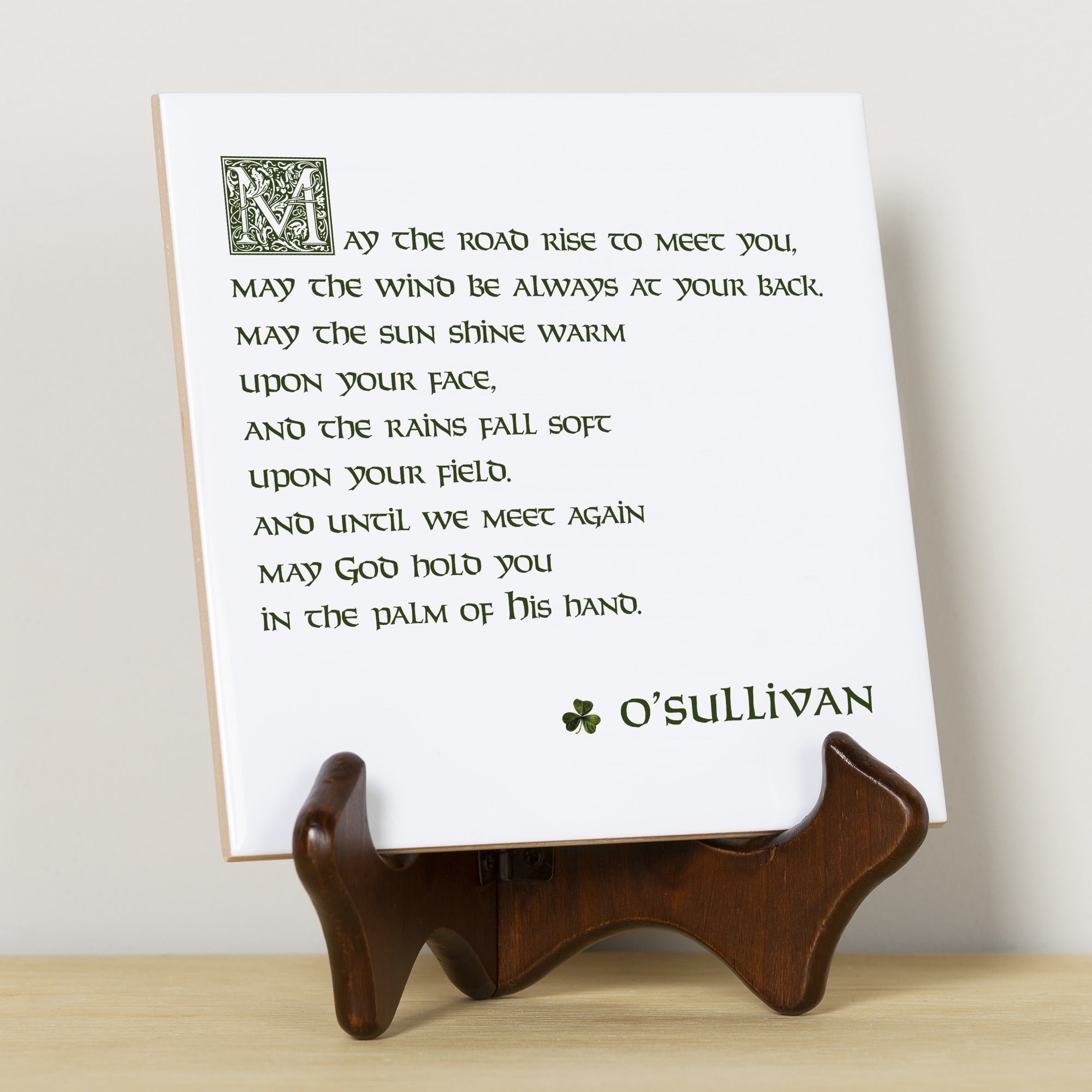 Show off your Irish pride with this charming decorative tile, measuring 6 inches square and serving for a trivet at mealtimes. Personalize with your family name to add a personal touch to this piece, which bears the words of the beautiful Irish blessing in a traditional Celtic font. Captivating decor for your kitchen, and also makes a thoughtful gift for an Irish friend.