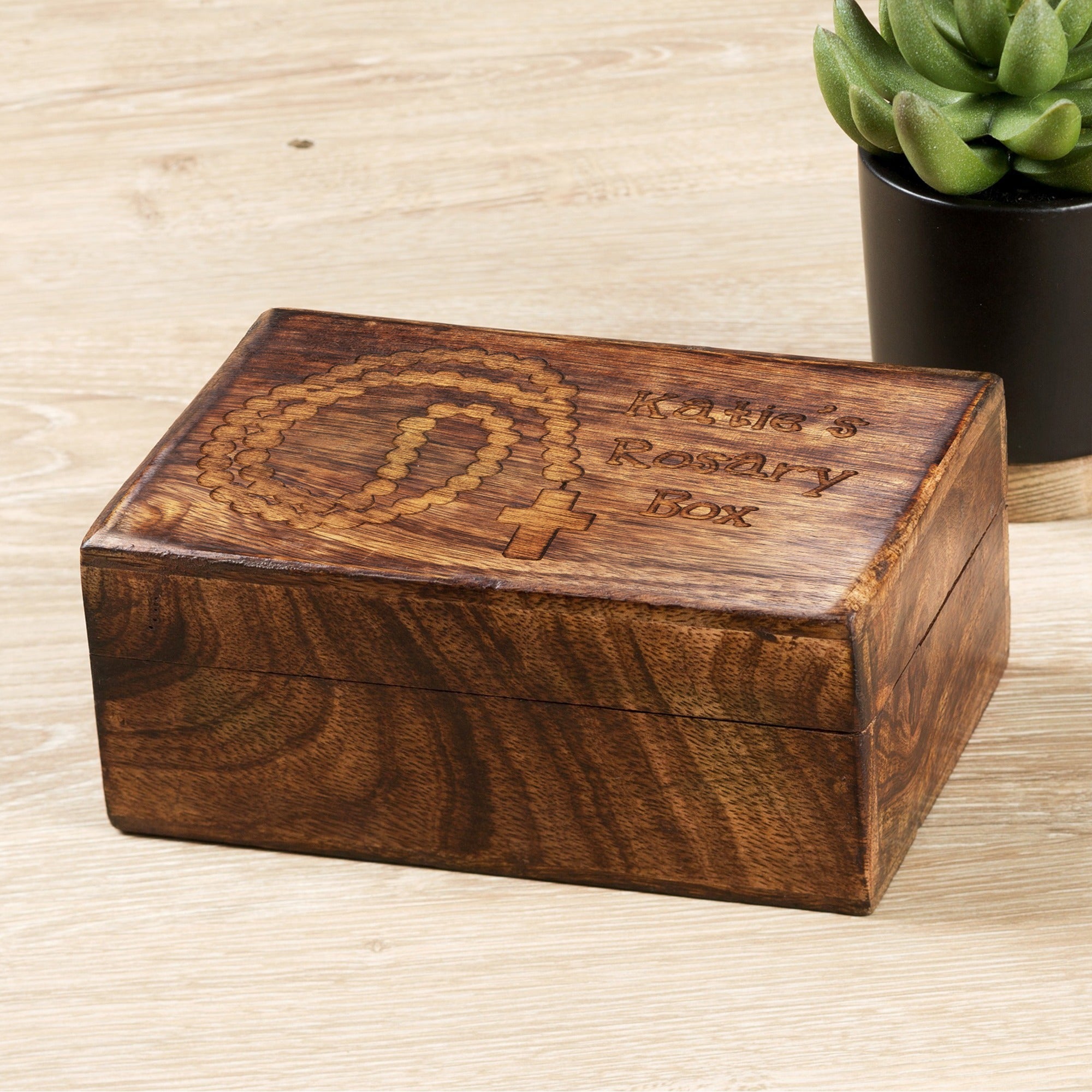 An artful rosary design decorates the lid of this personalized wood box for children while a playful font features a child's name along with the words "Rosary Box". This is a fantastic, one-of-a-kind custom children's gift exclusive to The Catholic Company. A special gift that any child will cherish. Makes a great gift for Baptisms, First Communion, birthdays, and Christmas. Natural mango wood is a distinctive and unique wood with lots of color variation and a slightly aged appearance, perfect for absorbing wear and tear. Get creative with gifts you can place inside the box, such as prayer cards, a children's rosary, patron saint medals, and a how to pray the rosary booklet. Share a meaningful gift on those special occasions!
