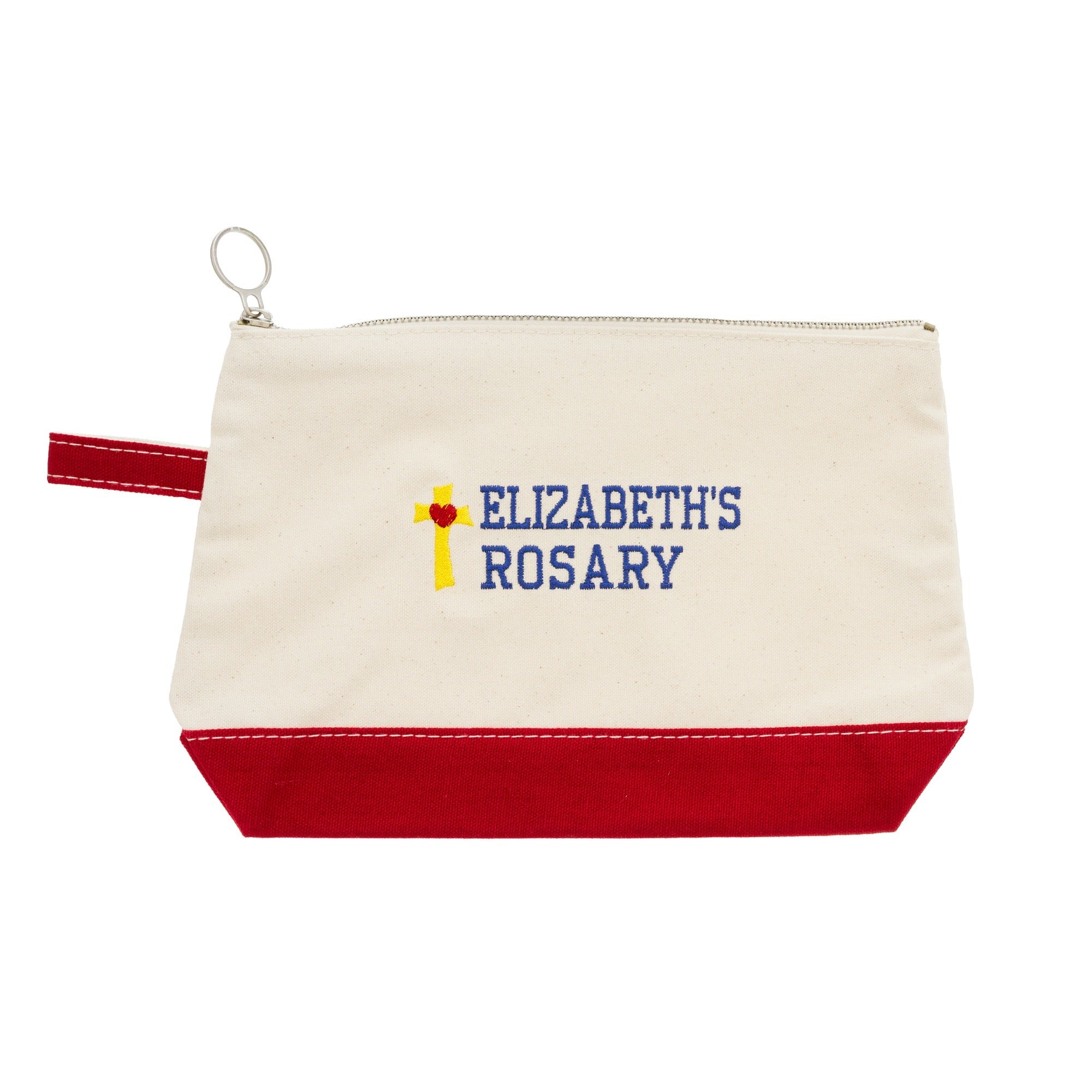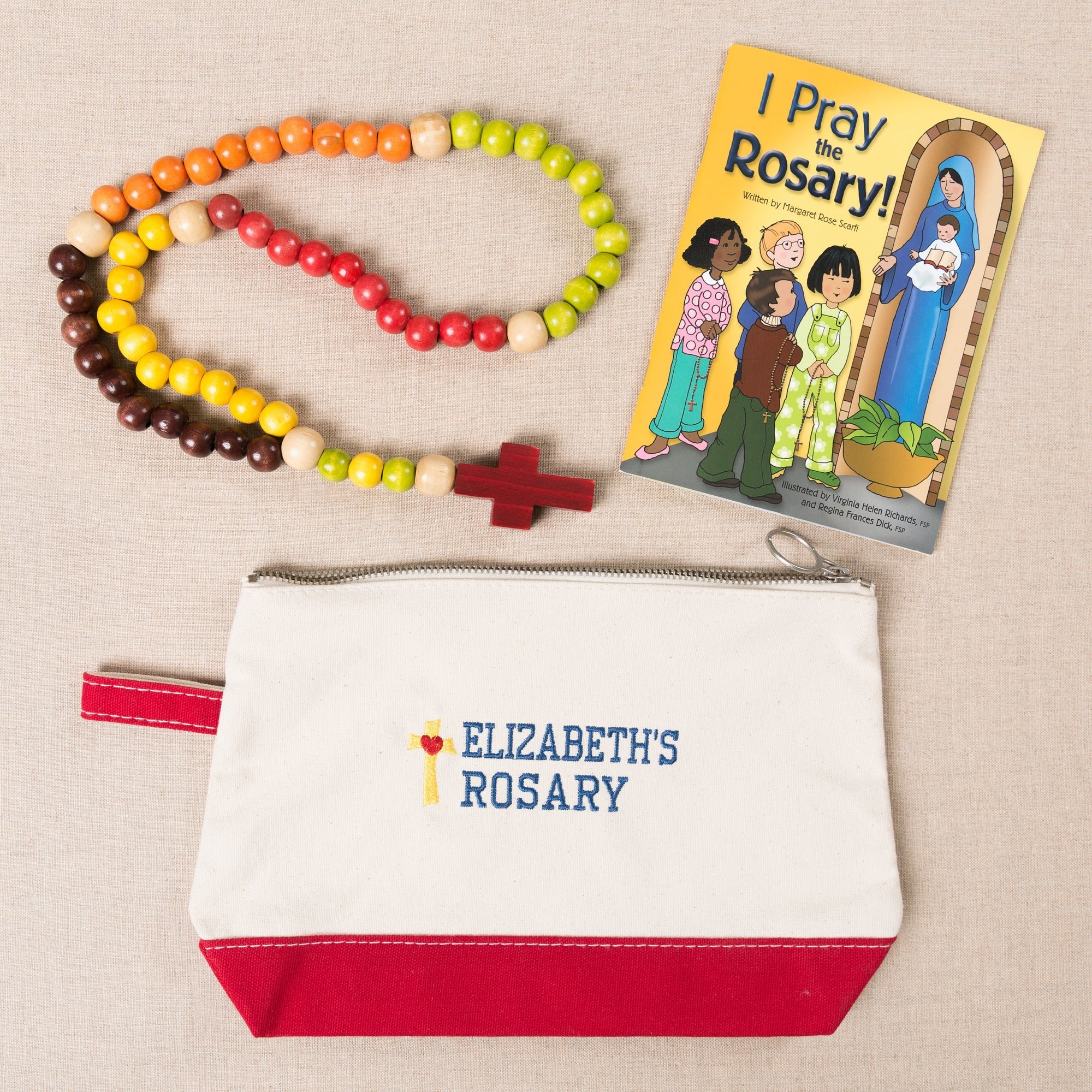 This Catholic Company exclusive set includes a canvas zippered bag personalized with your child's name, a large wood-bead rosary, and a sweet rosary guide for kids: perfect for little ones to take to Mass. The colorful beads are fun and attractive, ideal for teaching little ones how to pray the rosary prayers. An added bonus is that the canvas bag is large enough to hold additional small books or other small trinkets to bring to Mass. A wonderful, practical gift that will be used often!