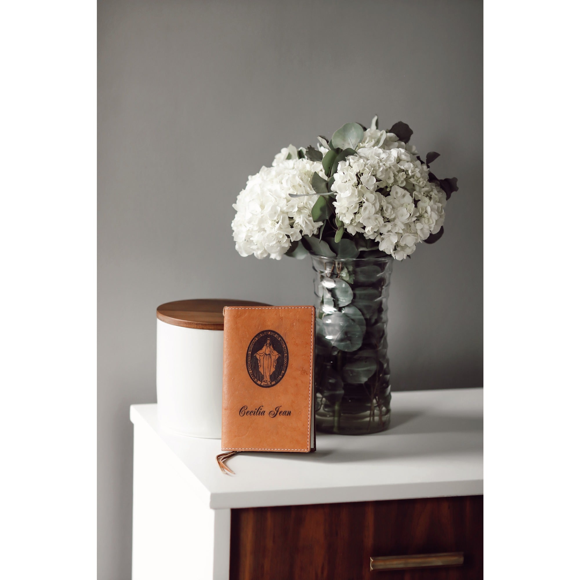 Express your devotion with our exclusive Personalized Miraculous Medal Cover for Magnificat, crafted in genuine saddlery leather. Exclusively designed for The Catholic Company, it fits your regular print Magnificat and features intricate engravings of the Miraculous Medal. This U.S.-made cover includes a leather page marker and back pocket for prayer cards, making it an ideal daily Mass companion and thoughtful gift.