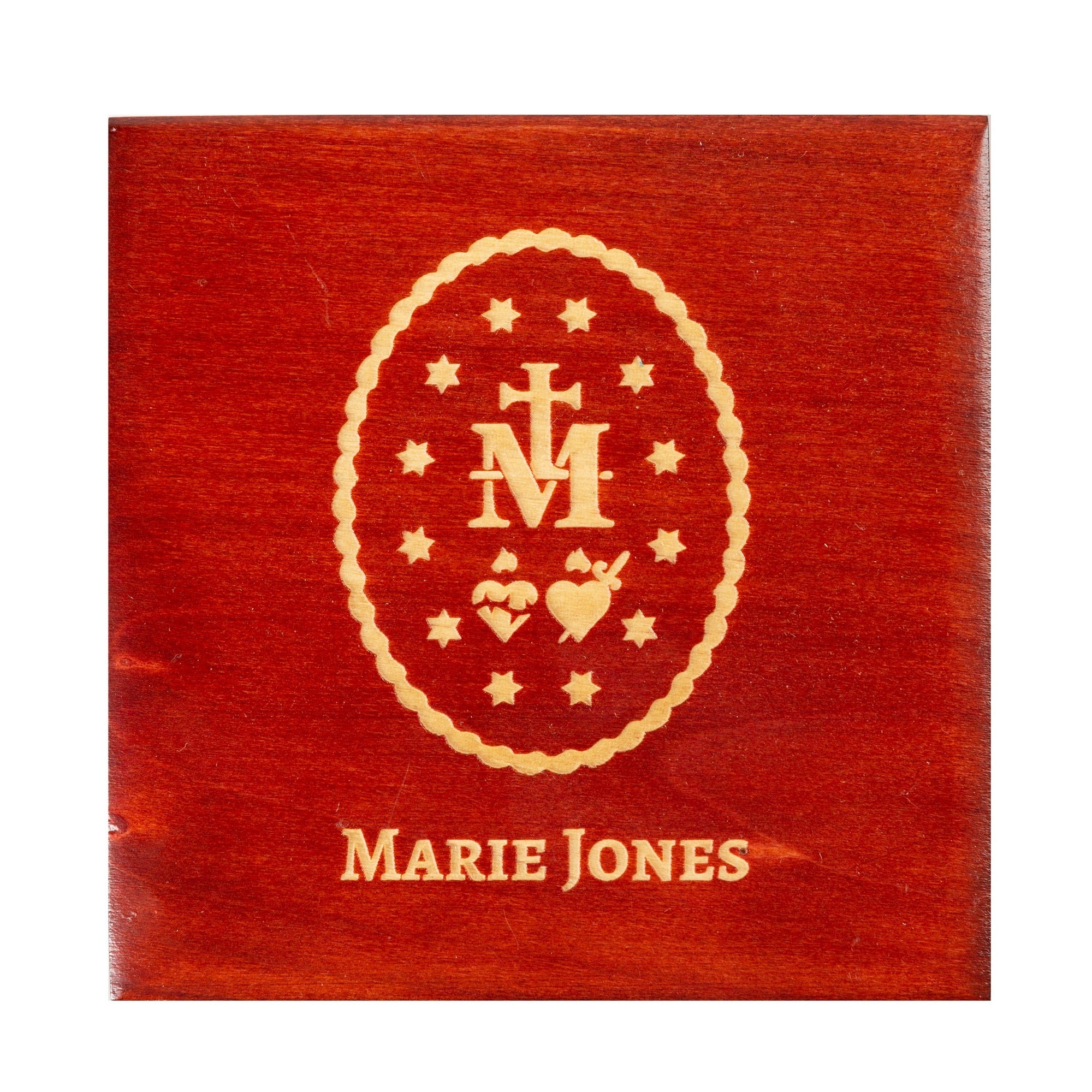 Honor Our Lady by proudly displaying this ornate keepsake box, crafted from red cherry wood and featuring a fully functioning lock and key. A classy item that proclaims your love for the Blessed Mother, it bears an engraving of the Miraculous Medal, a sacramental which during its 200-year history has often been associated with miraculous interventions from Our Lady. Free personalization makes this a delightful gift for a friend with special devotion to Mary.