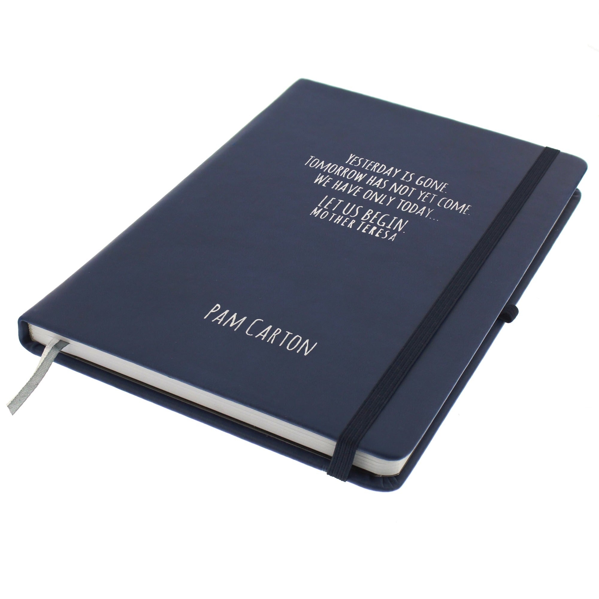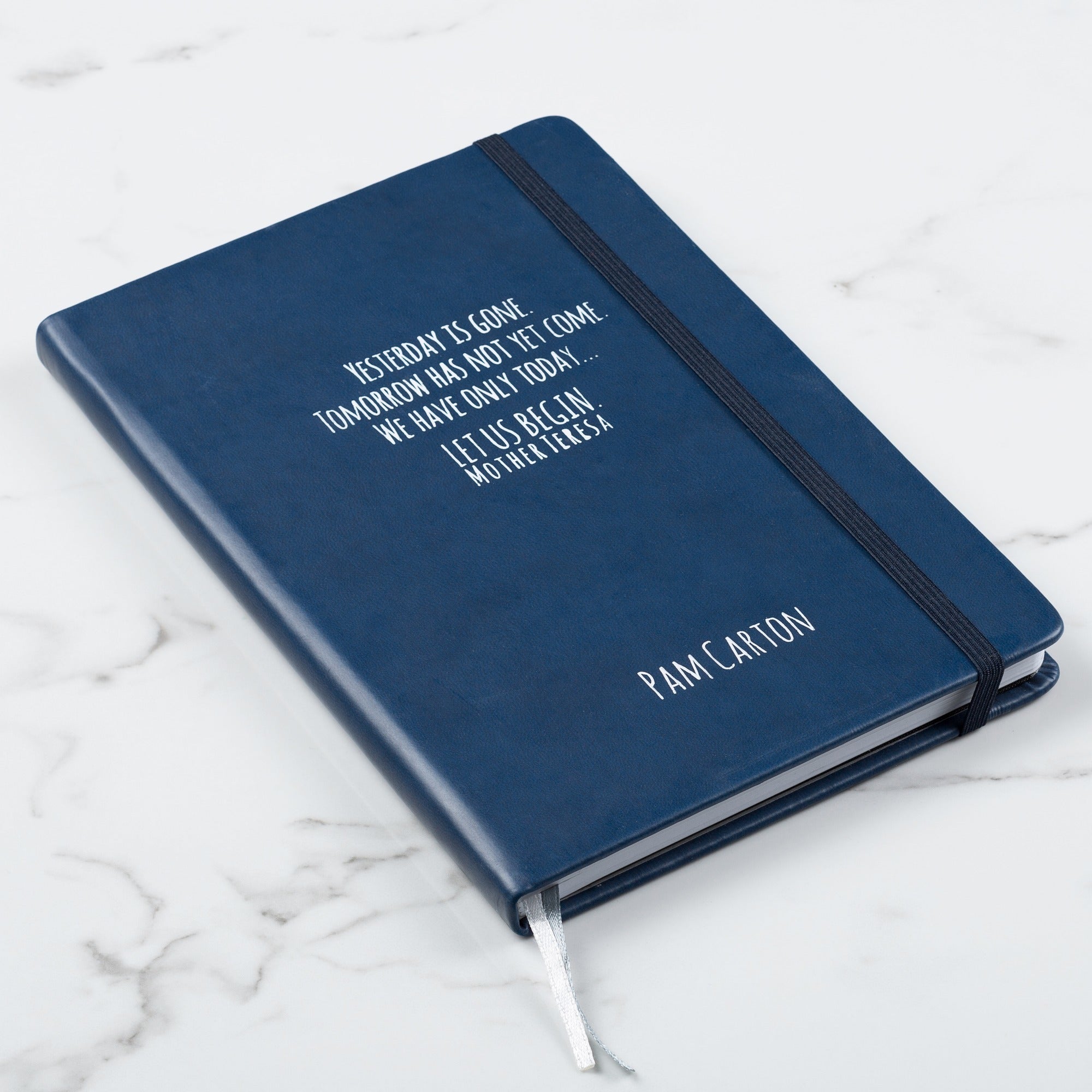 The Personalized Mother Teresa Today Journal is a heartfelt gift rooted in the spiritual wisdom of Mother Teresa. Made from genuine leather with a soothing azure hue, it features lined pages, a ribbon marker, and an elastic band closure. This Catholic Company exclusive is the perfect companion for solitude, reflection, and prayer. Personalization included.