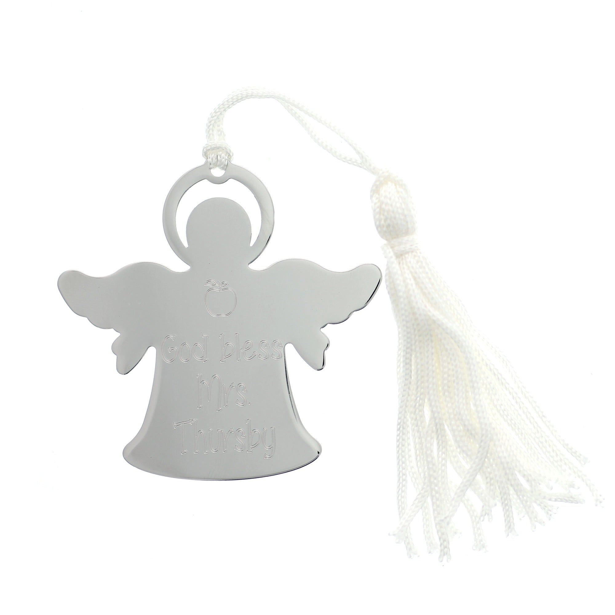 The Personalized Silver Angel Teacher Ornament is a beautifully designed keepsake, perfect for expressing gratitude to teachers this Christmas. Featuring an exclusive design with a white tassel hanger, it includes personalization with "God bless" and the teacher's name. Elegantly nickel-plated with a shiny non-tarnish finish, this 6" x 4.6" ornament makes a thoughtful gift, packaged in a box for easy gifting.