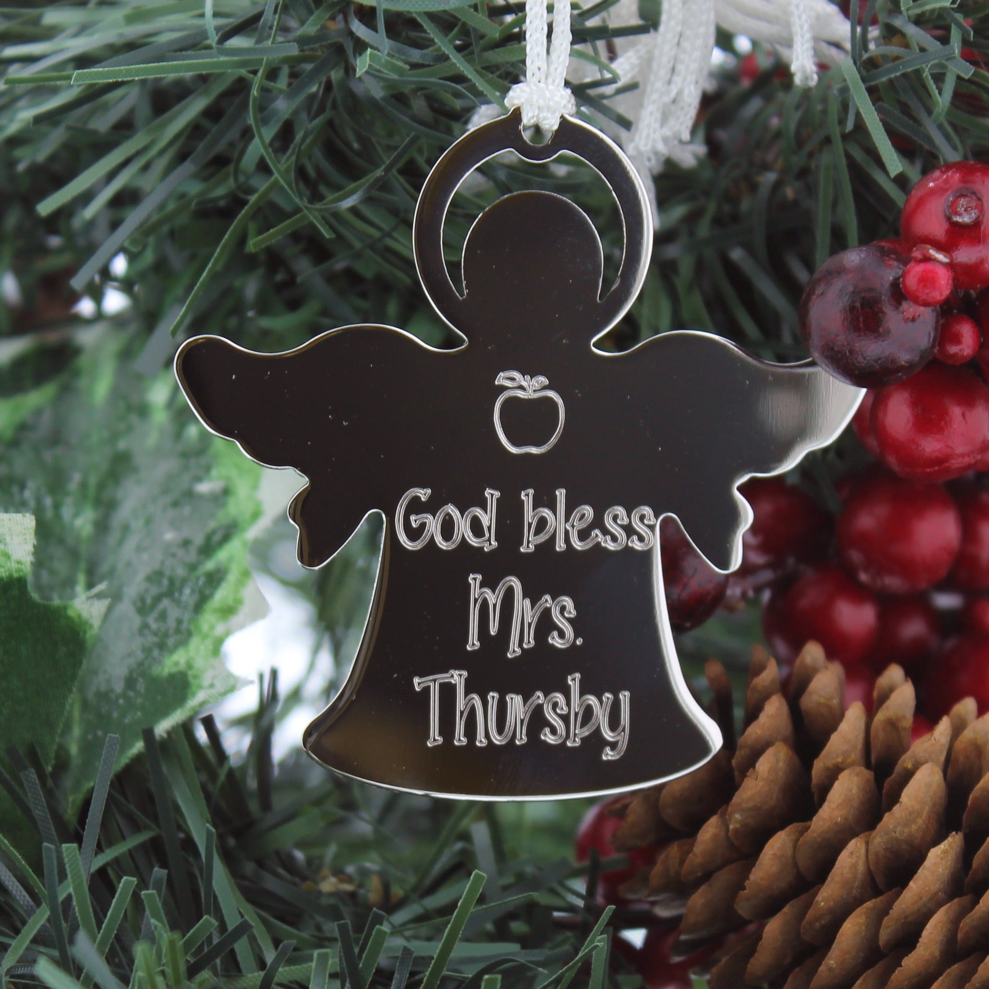 This classically-styled ornament is a thoughtful way to thank your teacher this Christmas. The angel features the words "God bless" and the teacher's name. Simple and endearing, with a beautiful silver finish.