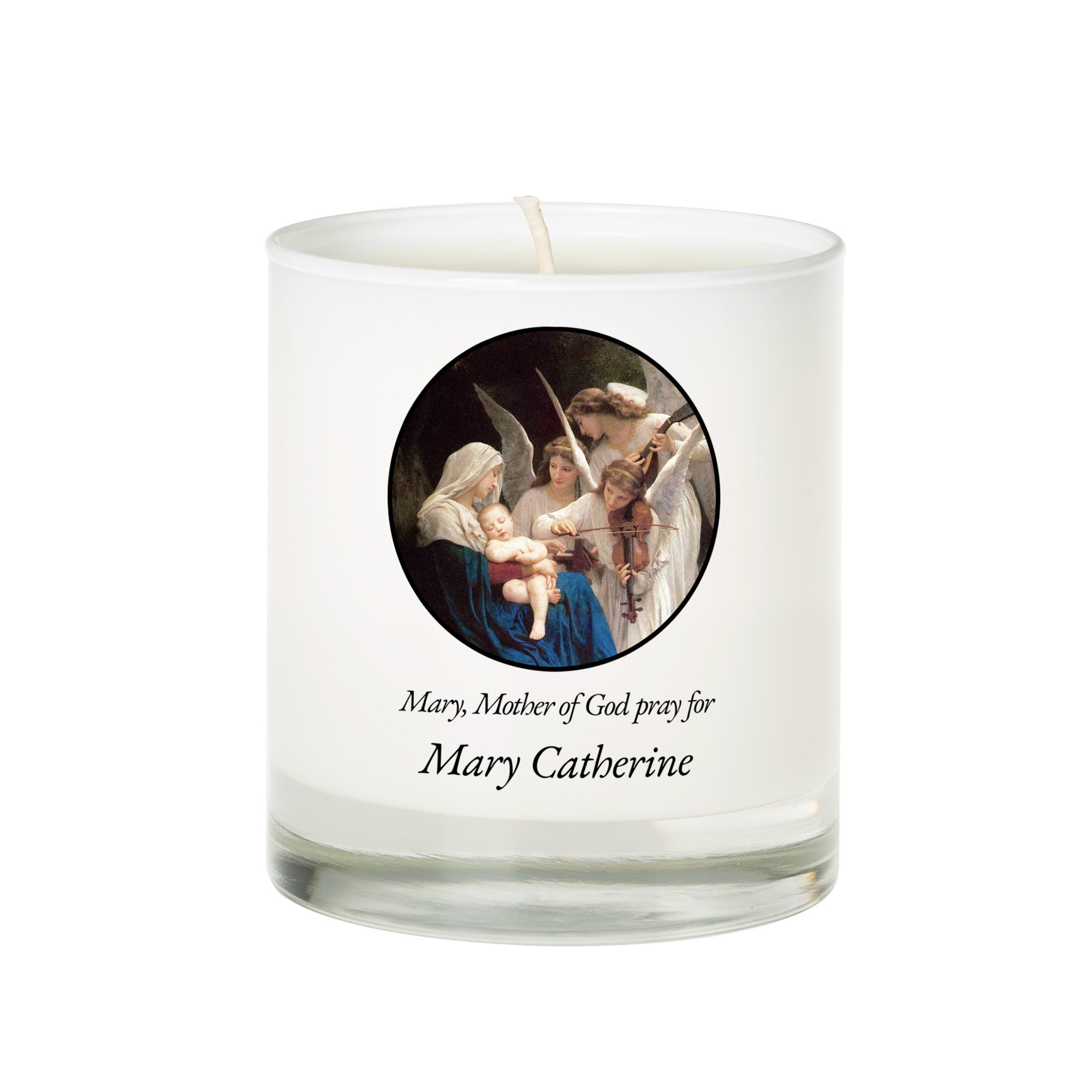 Lay your intentions at the feet of Our Lady with this lovely candle, featuring an image of the lovely artwork The Song of the Angels by William Adolphe Bouguereau. Personalize for free so that the candle reads “Mary, Mother of God, pray for [Name],” asking for prayers for yourself or for a friend in need. Beautiful home decor with a clean, fresh linen scent, makes a thoughtful gift for any occasion.