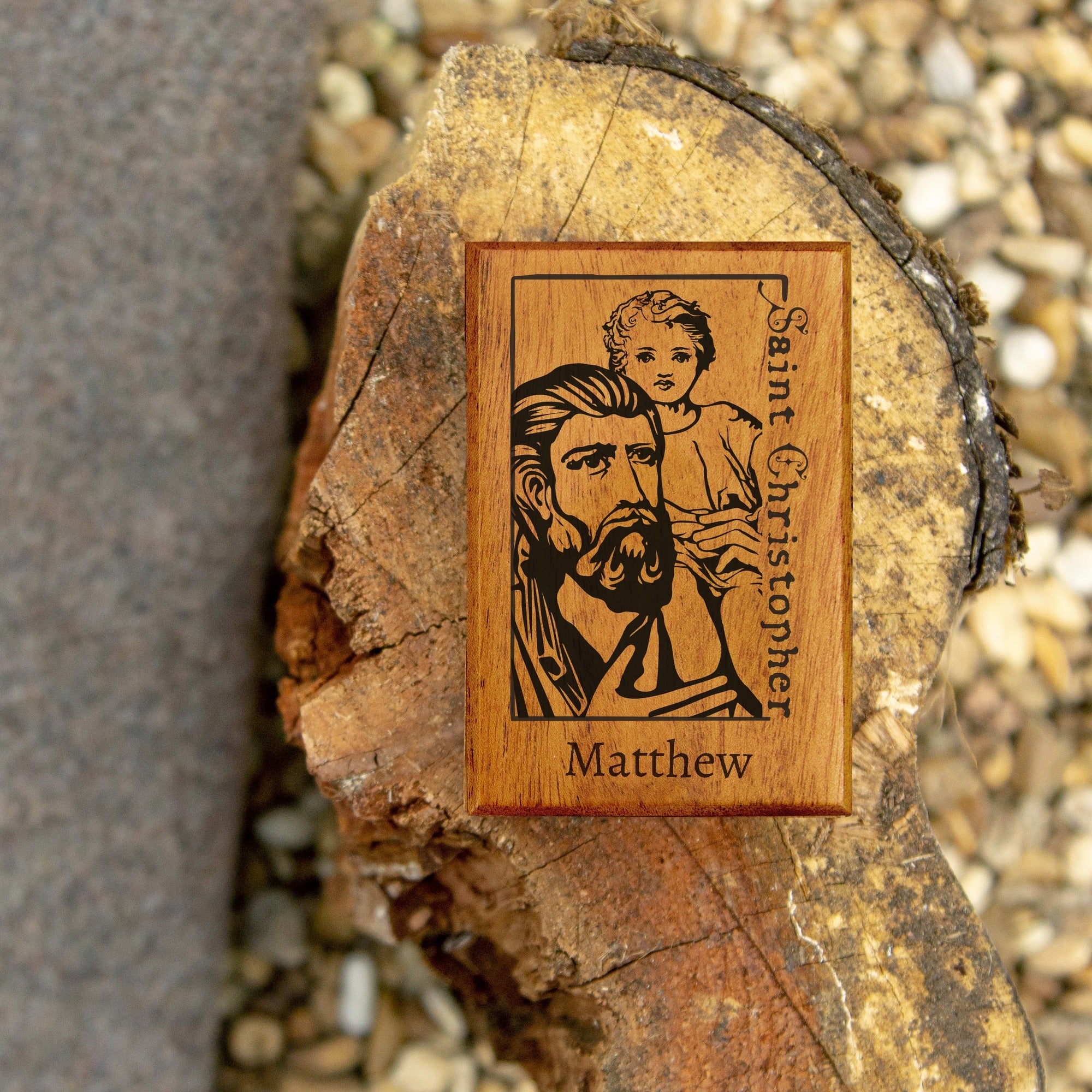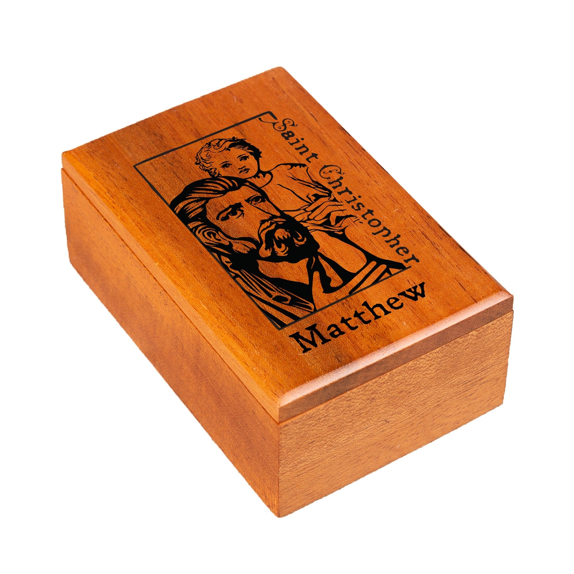 The story of St. Christopher carrying Christ across the river remains poignant and inspirational to this day, reminding us that we can overcome any obstacle if we put our trust in God. Thoughtfully recall his holiness whenever you use this keepsake box, colored a warm light brown and overlaid with an image of the saint and free personalization (up to 12 characters). A thoughtful gift for confirmation or any special occasion!