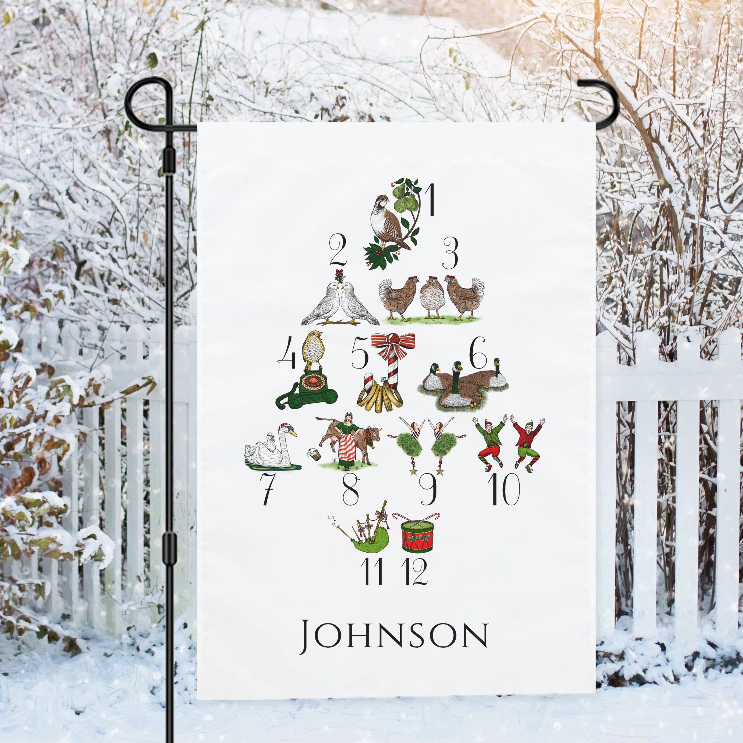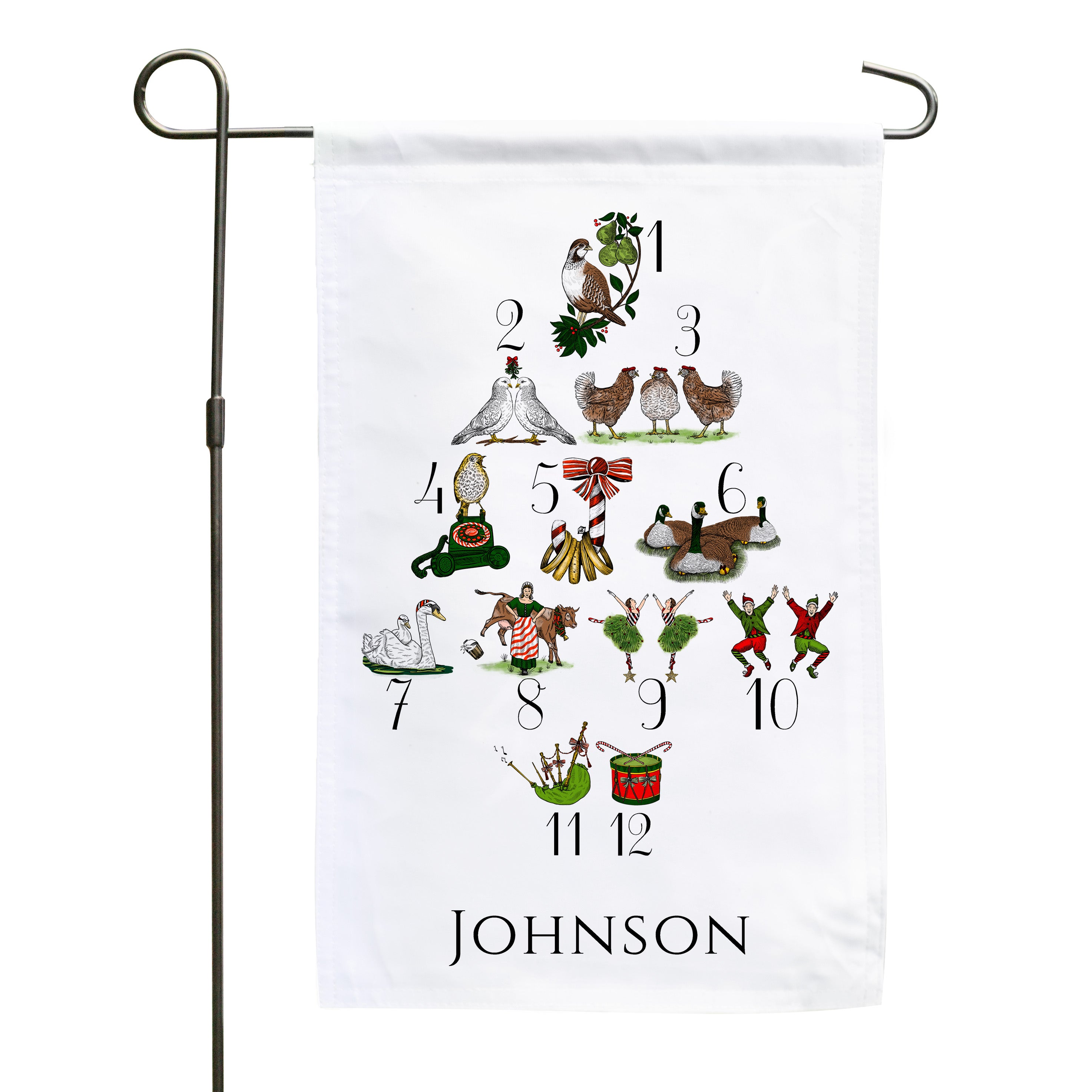 Decorate your lawn for the holidays with this garden flag, featuring adorable illustrations of the 12 Days of Christmas. With an original drawing for each day, including the Five Golden Rings, Eight Maids A-Milking, and Twelve Drummers Drumming, it provides a delightful way to show off your Christmas spirit. Free personalization of a family name makes this a truly unique gift to give this holiday season.