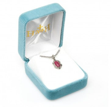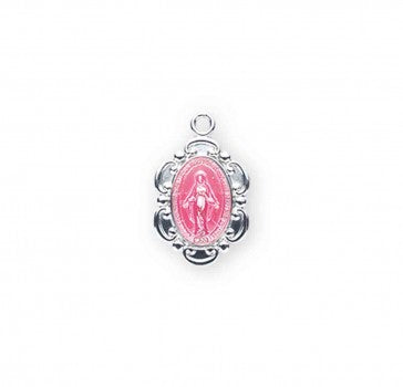 A layer of pink enamel adds a feminine pop of color to this Miraculous Medal. An ornamental border emphasizes Mary's majesty and gives the medal a more vintage flair. The graceful medal hangs on a surgical grade stainless steel chain for ease of care, shine and durability. A cheerful Marian pendant that makes a great gift for a sacrament or other special occasion. Made of solid .925 sterling silver.