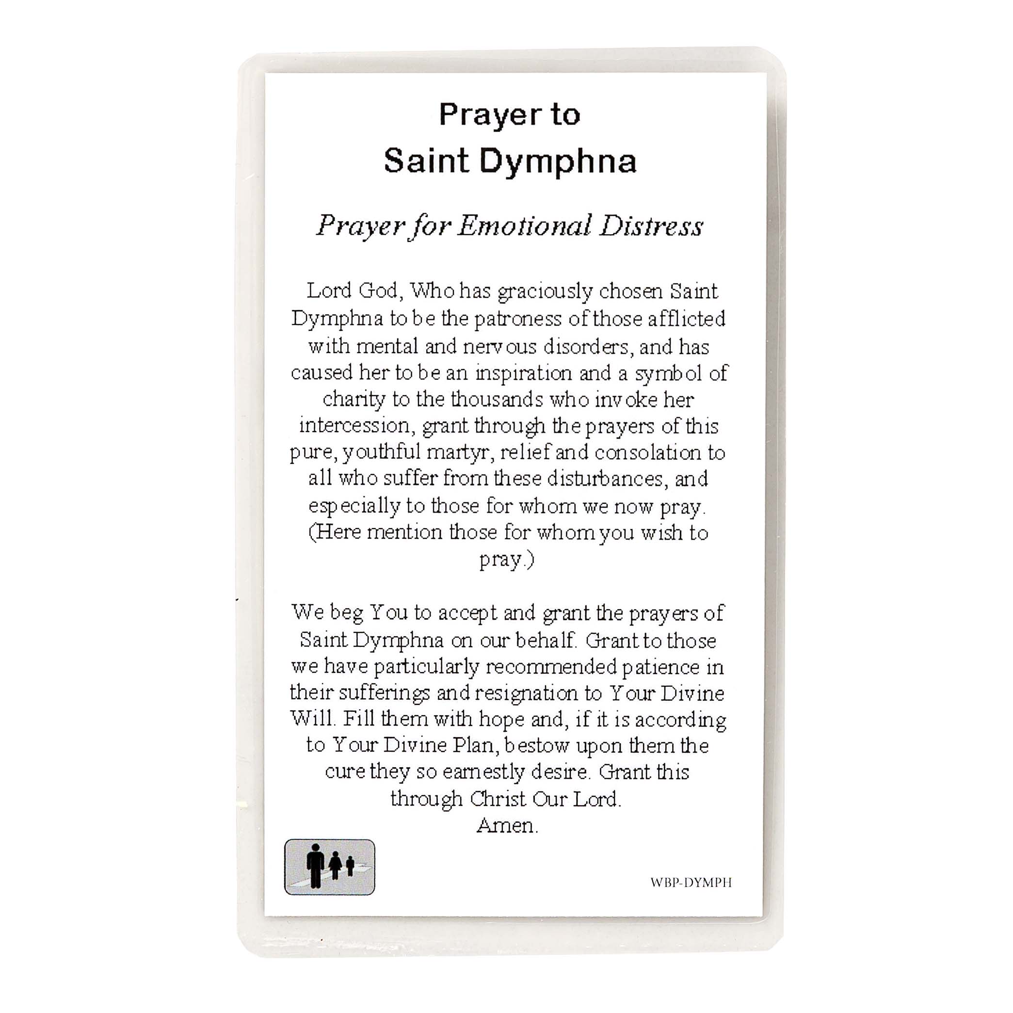 Laminated St. Dymphna prayer card with a pewter St. Dymphna medal on a 18" silvertone chain. Comes polybagged.
