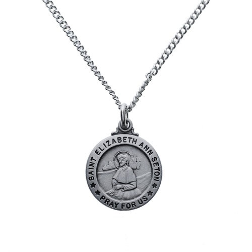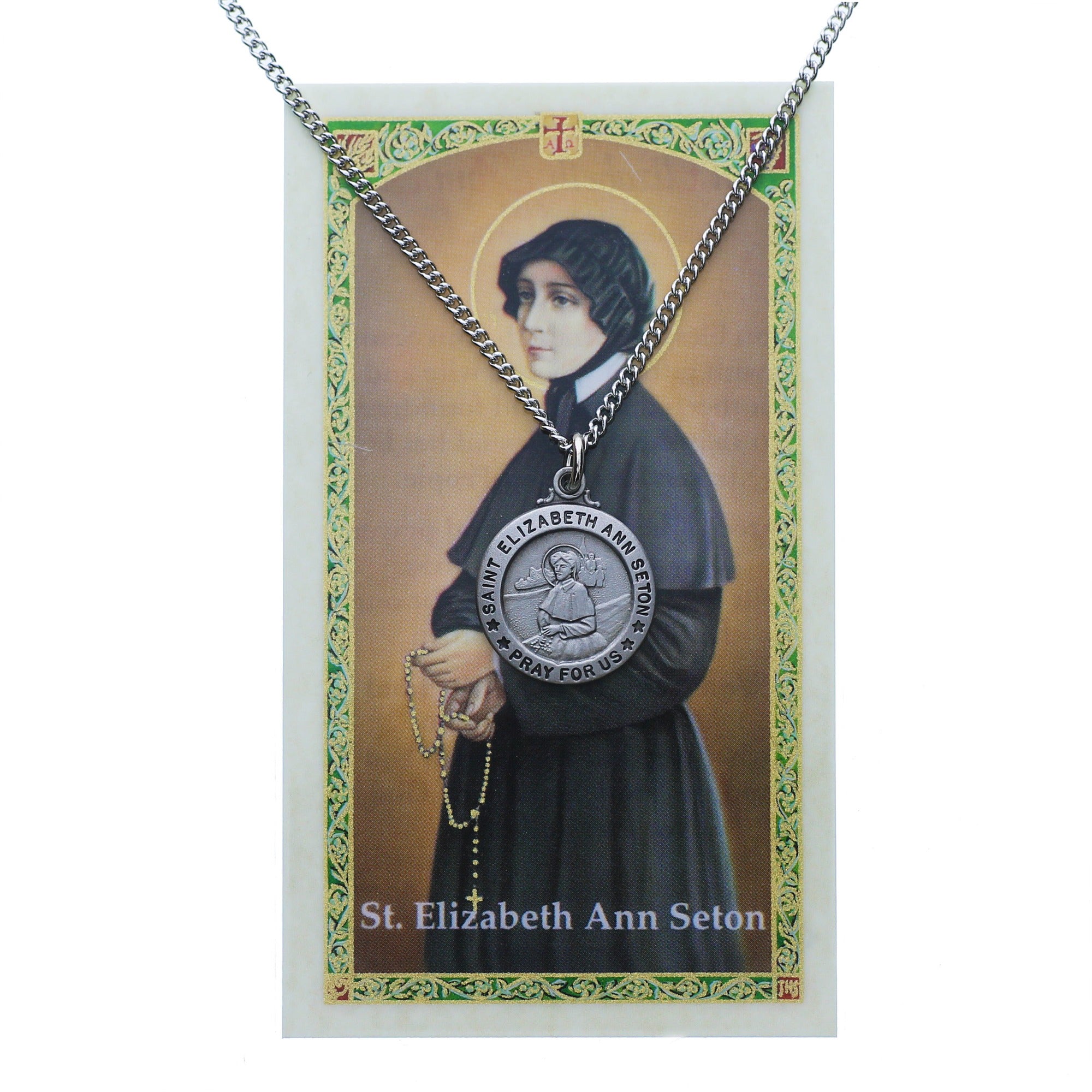 Laminated St. Elizabeth Ann Seton prayer card with a pewter St. Elizabeth Ann Seton medal on a 18" silvertone chain. Comes polybagged.
