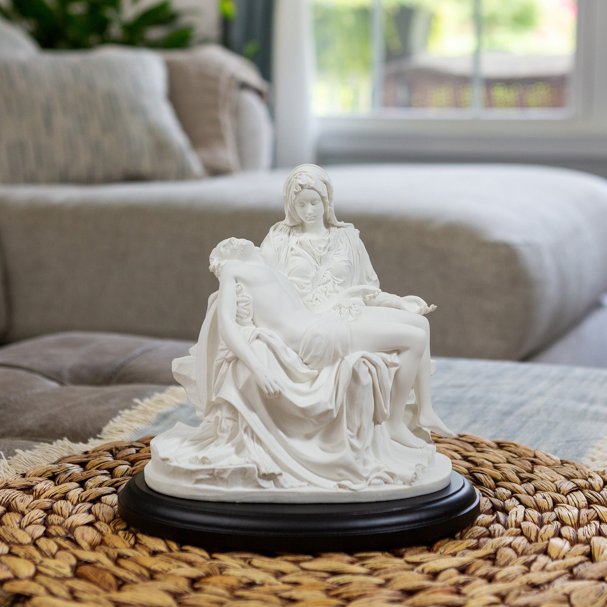 Pieta By Michelangelo Statue, White With A High Quality Black Base, 7". From the Veronese Collection. Dimensions: 6.5'' (W) x 5'' (D) x 7'' (H). Resin with wood base.