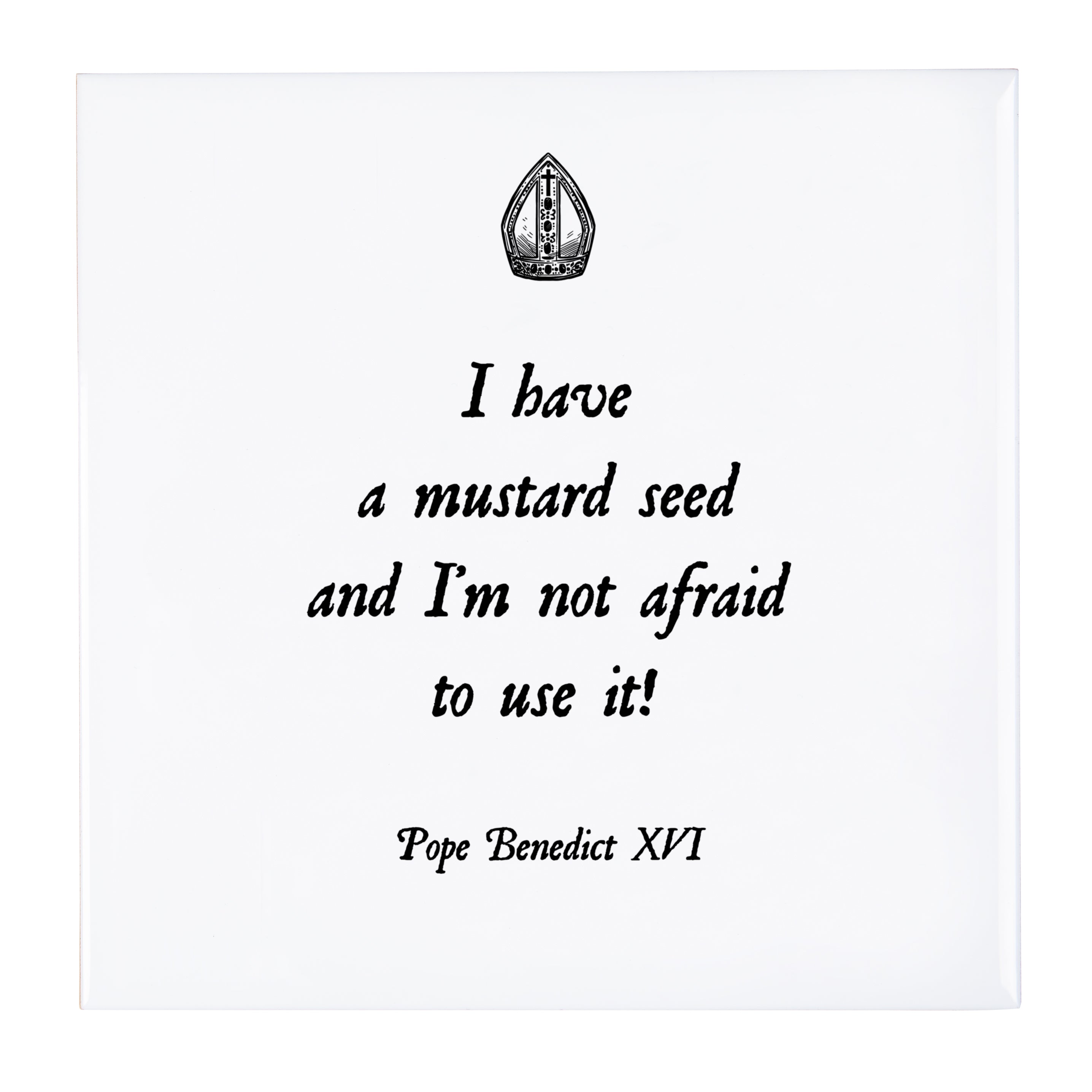 This decorative white tile features a clean design with the words "I have a mustard seed and I'm not afraid to use it!," including a small image of a bishop's miter with the words of late Pope Benedict XVI. As a man who endured the evils of Nazism as a child, he surely experienced trials to his faith, yet he courageously pursued truth throughout his life, which he gave in service to the Church during his decades as cardinal and Holy Father. A splendid tribute to a remarkable man, this tile provides joyful room decor or a handy trivet at mealtimes.
