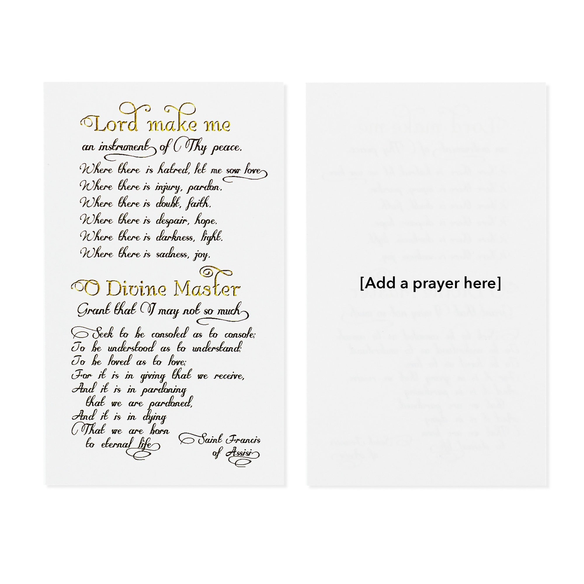 The Prayer of St. Francis is a powerful prayer of peace and self-surrender to God. It is a prayer for all people, all times, and all places. That being said, distributing elegant, personalized prayer cards with this message serves as a thoughtful way of enhancing your celebration or remembrance. Tailored to suit your needs, you can select a message for the back or provide your own. Send them by themselves or as a memorable addition to a thank you note or birthday card.