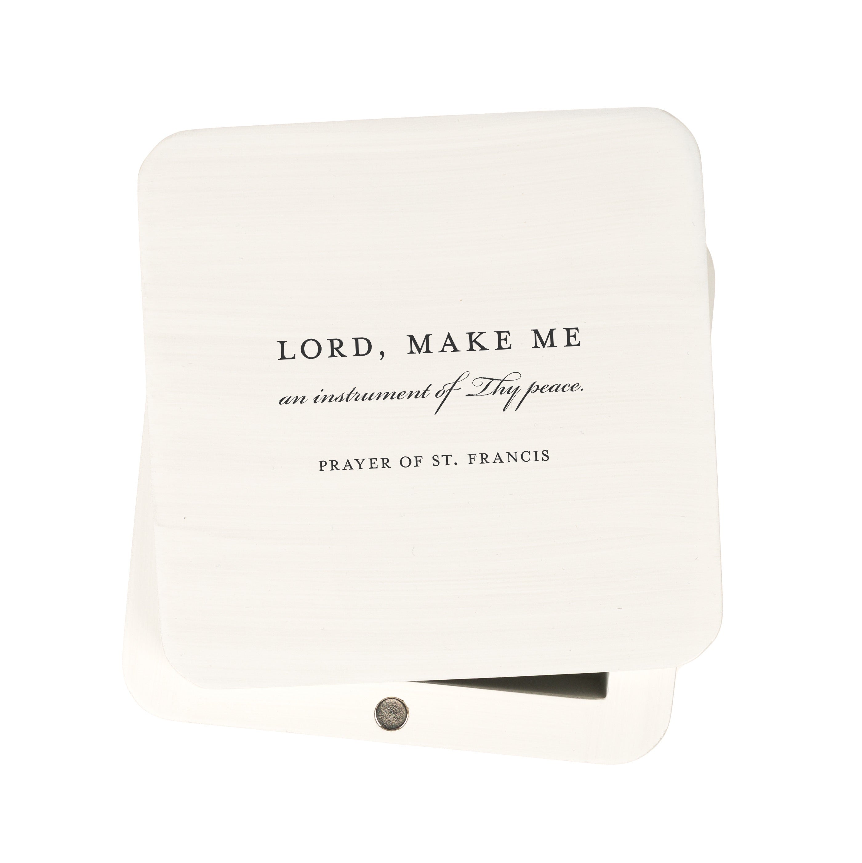 This elegant white matte keepsake box, exclusively designed by The Catholic Company, features a magnetic closure to safely store precious items like rosaries or jewelry. The lid is beautifully scripted with an excerpt from the Prayer of St. Francis, "Lord, make me an instrument of Thy peace." A thoughtful and stylish gift, it encourages living in peace and faith, perfect for a cherished woman.