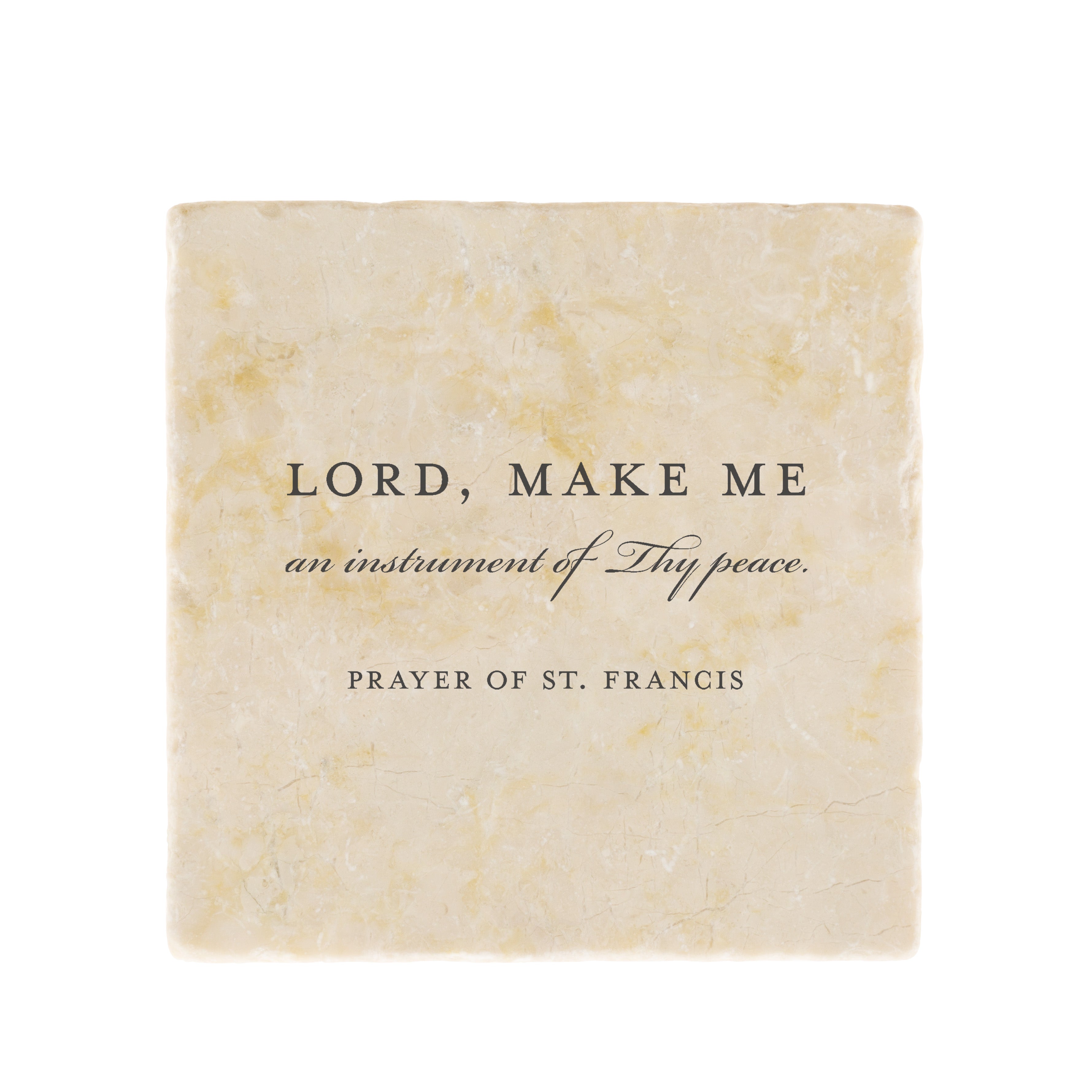 Featuring the inspiring words "Lord make me an instrument of thy peace," this 6x6 tumbled stone offers a meaningful addition to any home decor. Designed exclusively by The Catholic Company, it serves both as a decorative piece and functional trivet. With a matte finish and no-slip rubber feet, it makes for a thoughtful gift or personal reminder of the peace sought in prayer.
