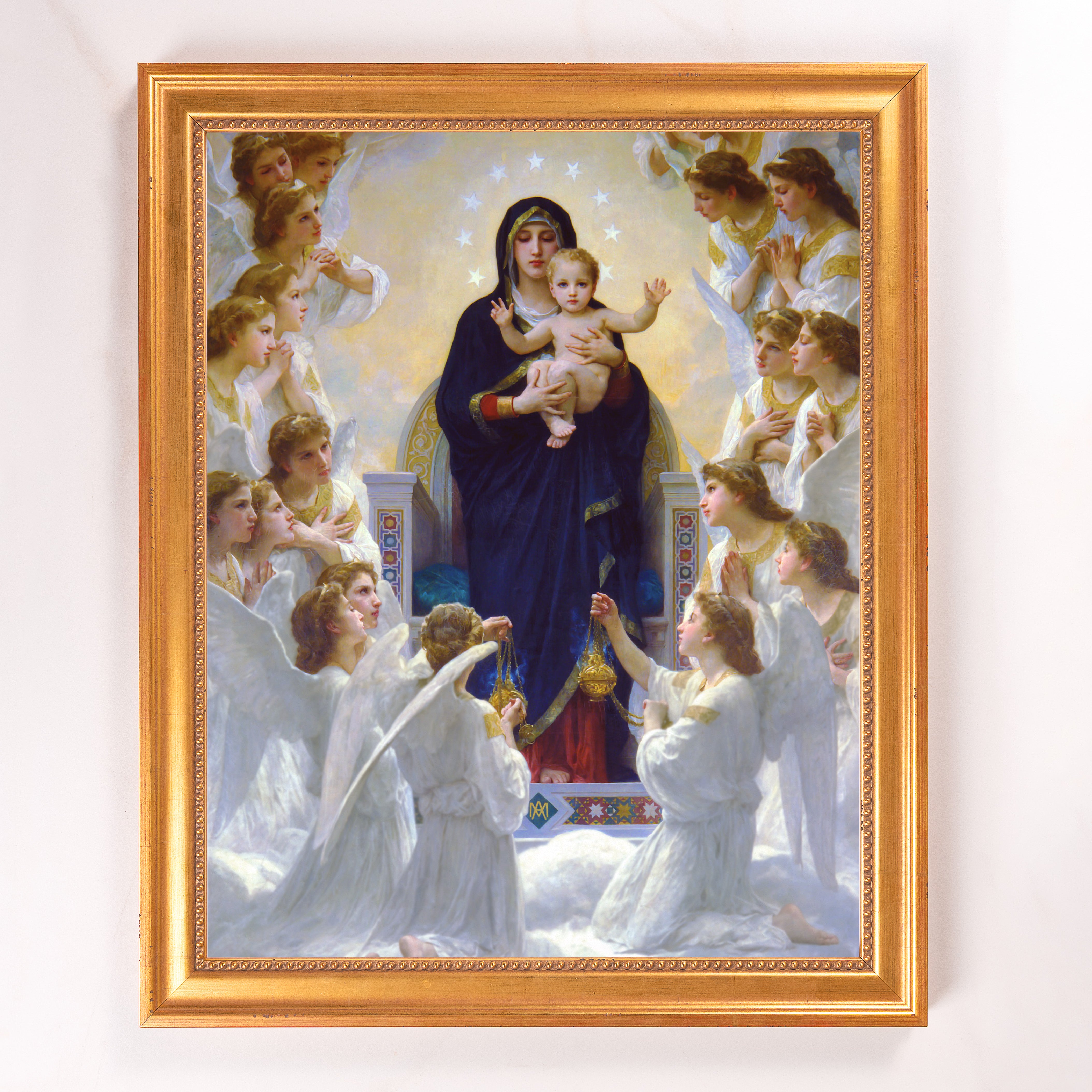 Featured here is Queen of Angels, painted by William-Adolphe Bouguereau in 1881. Mary holds the Christ Child from a heavenly throne while angels adore and glorify Him. It's a reminder of the purity and power of Christ & His mother, and an inspiration to call on them for every need.
