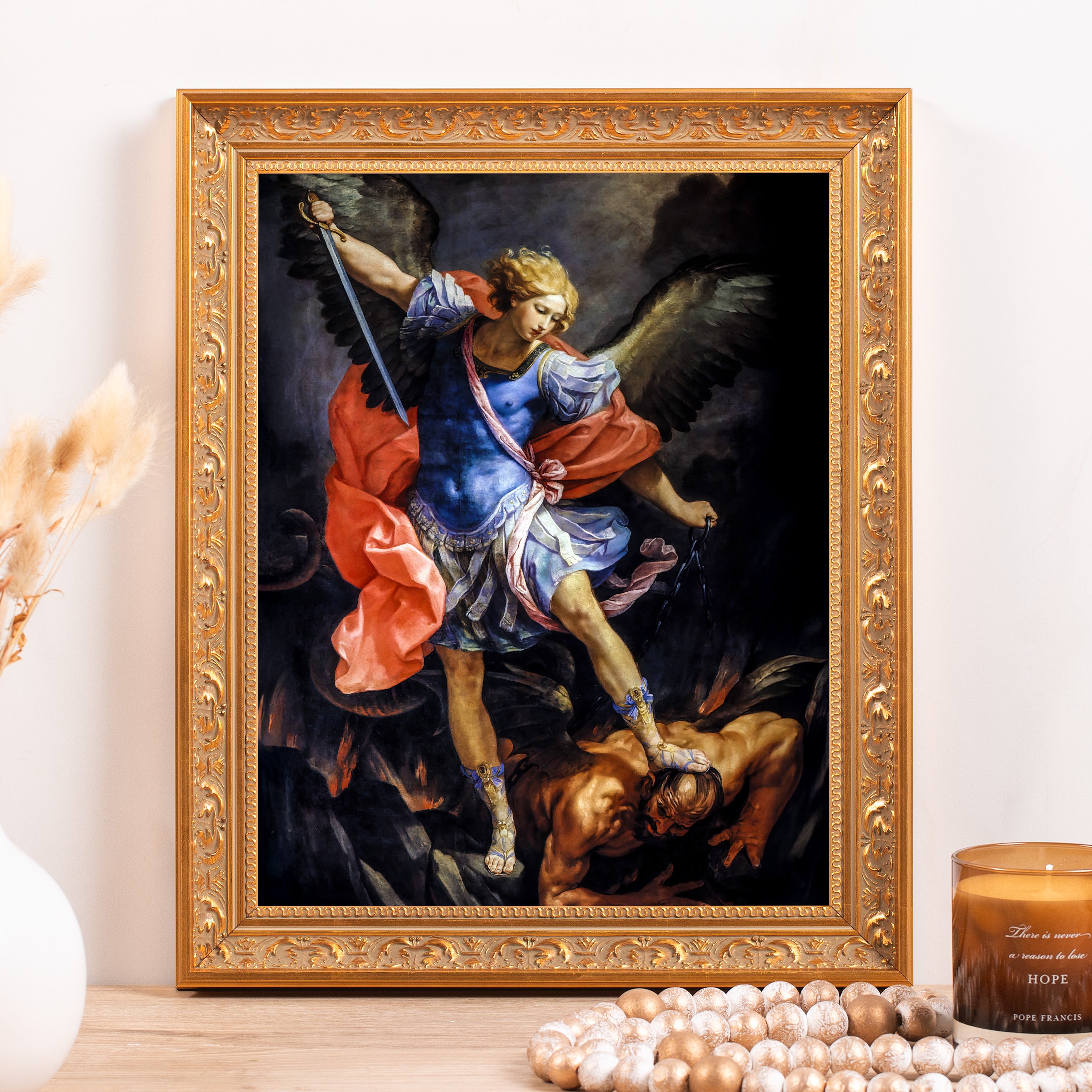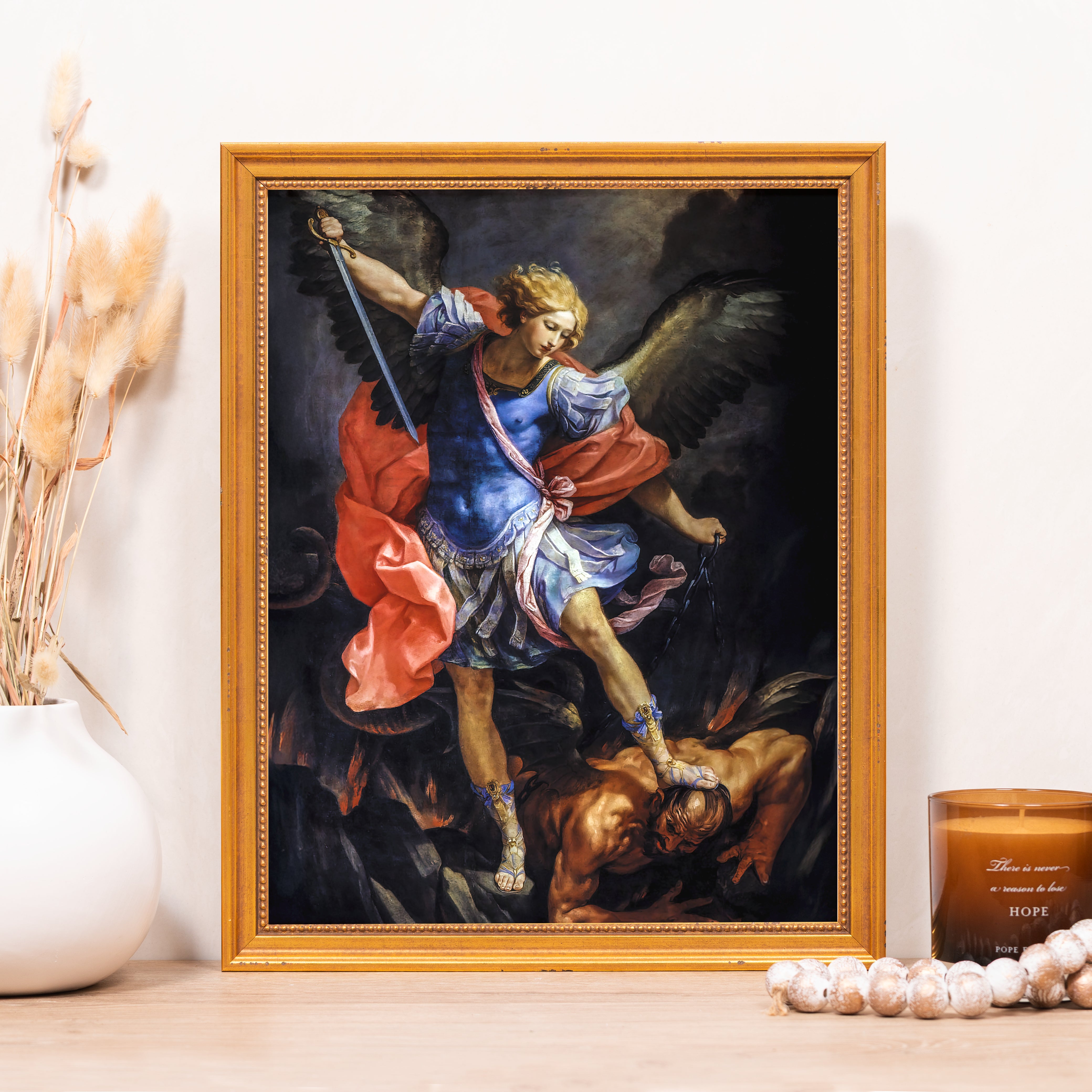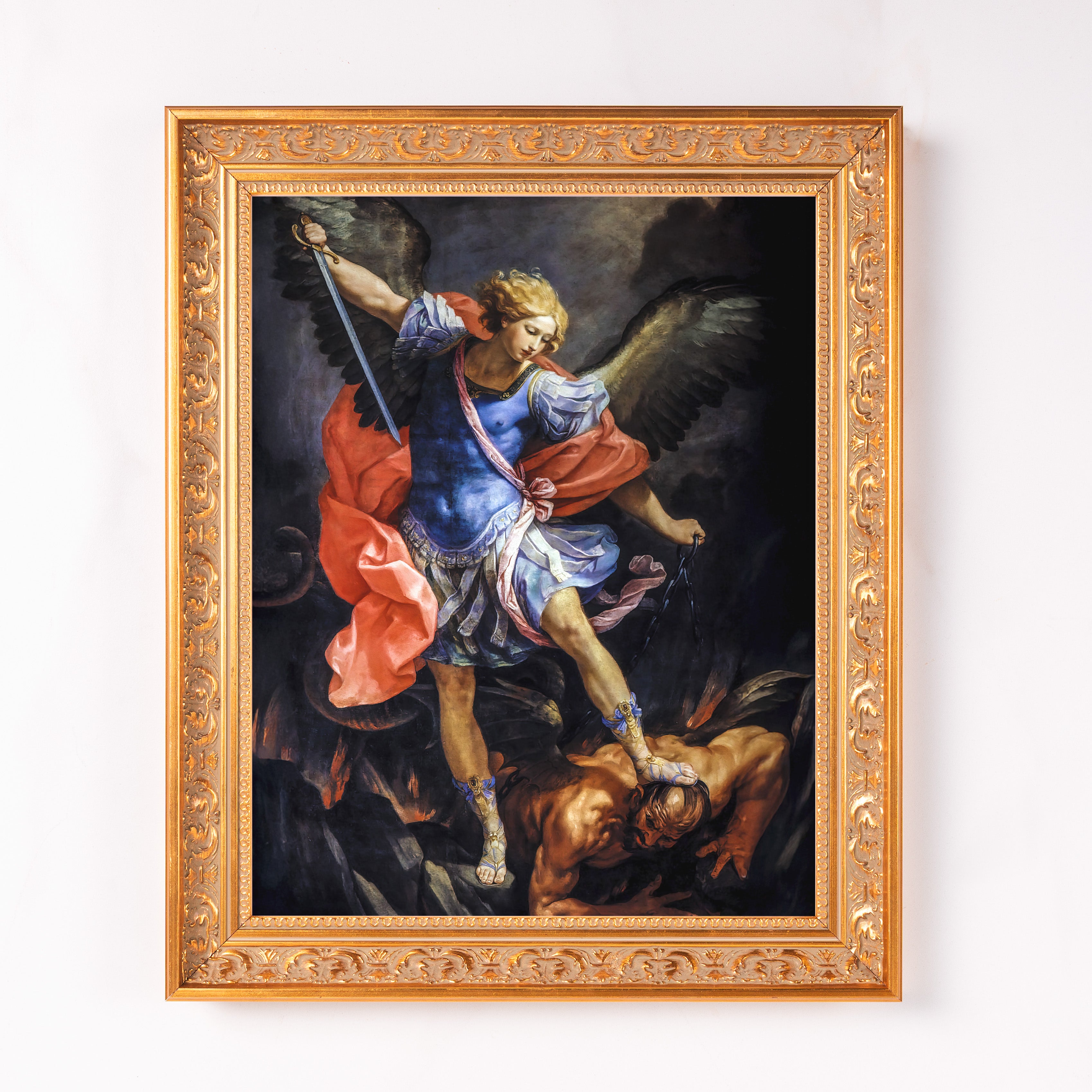 Featured here is Guido Reni's Archangel Michael Defeating Satan, showcasing St. Michael's power and divine justice, his unwavering faith and loyalty to God, and the moment of his victory over evil. It reminds us of his powerful intercession for our protection, and models uncompromising faith, even in the face of those hostile to what we believe.