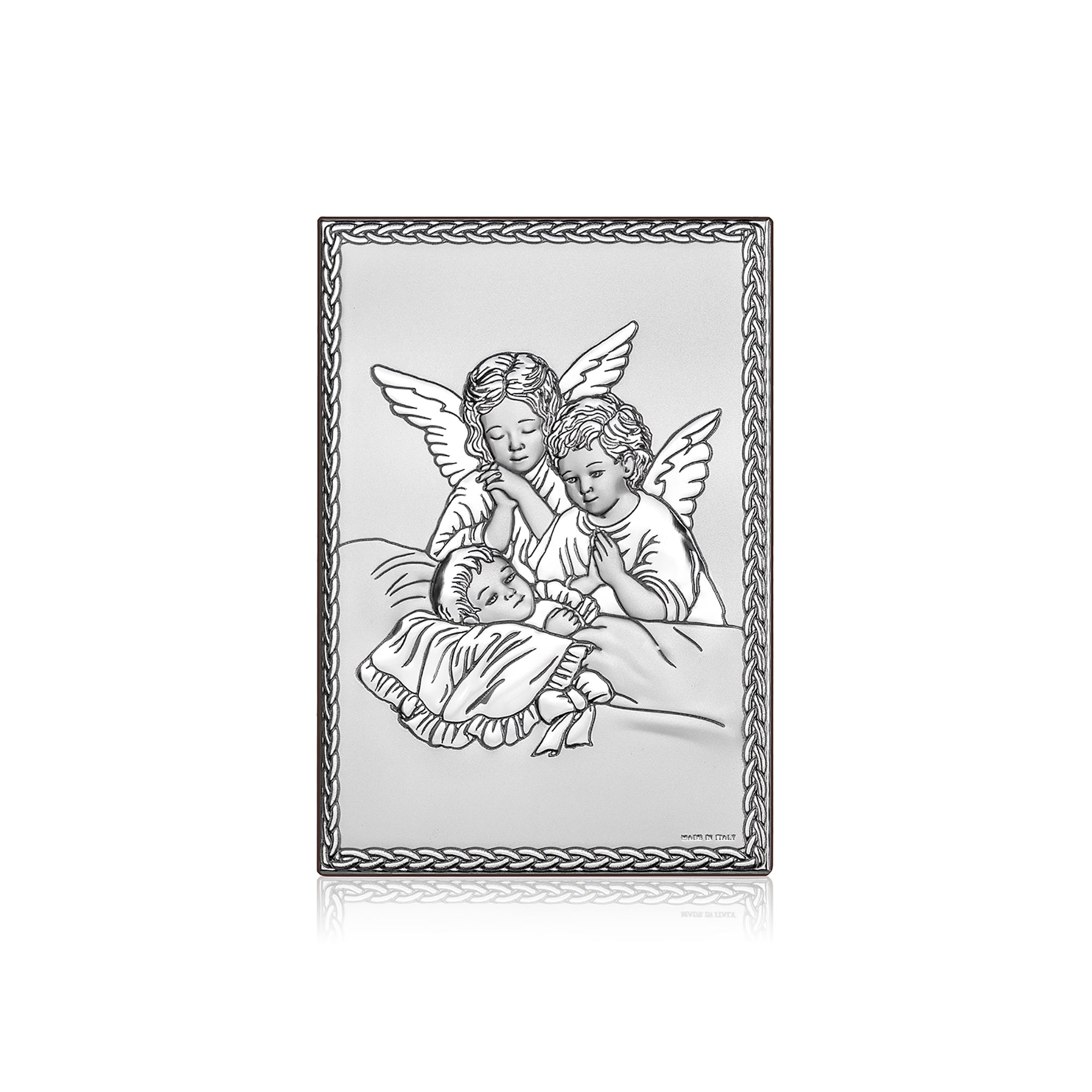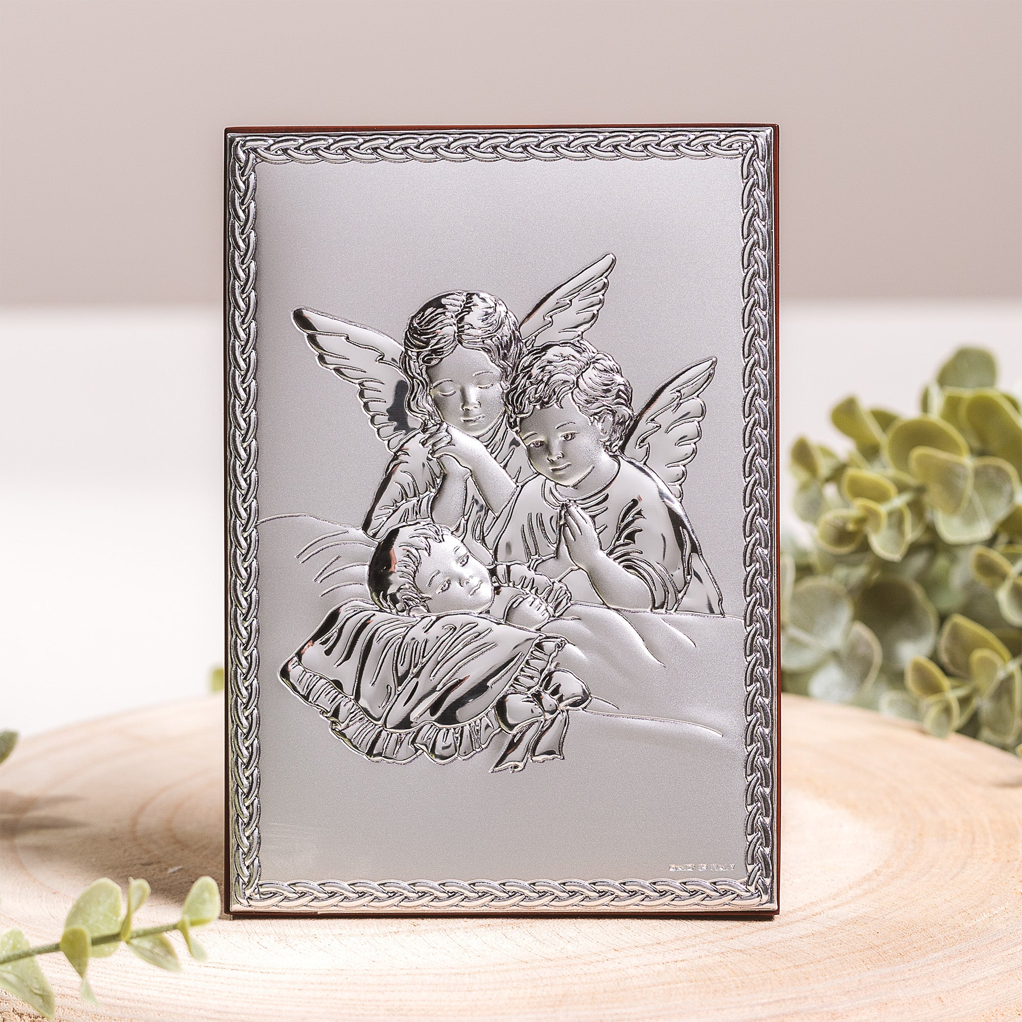 This precious silver-plated plaque features a little child under the protection of the Guardian Angels while sleeping soundly as they stand watch and pray overhead. The rectangular plaque has a roped border and engraved design. A wonderful gift for a New Baby, Baptism or Baby Shower, it is love, protection and blessing for a child you cherish. Makes a sweet accent in baby's room that will teach them about honoring their Guardian Angel. Made in Italy.