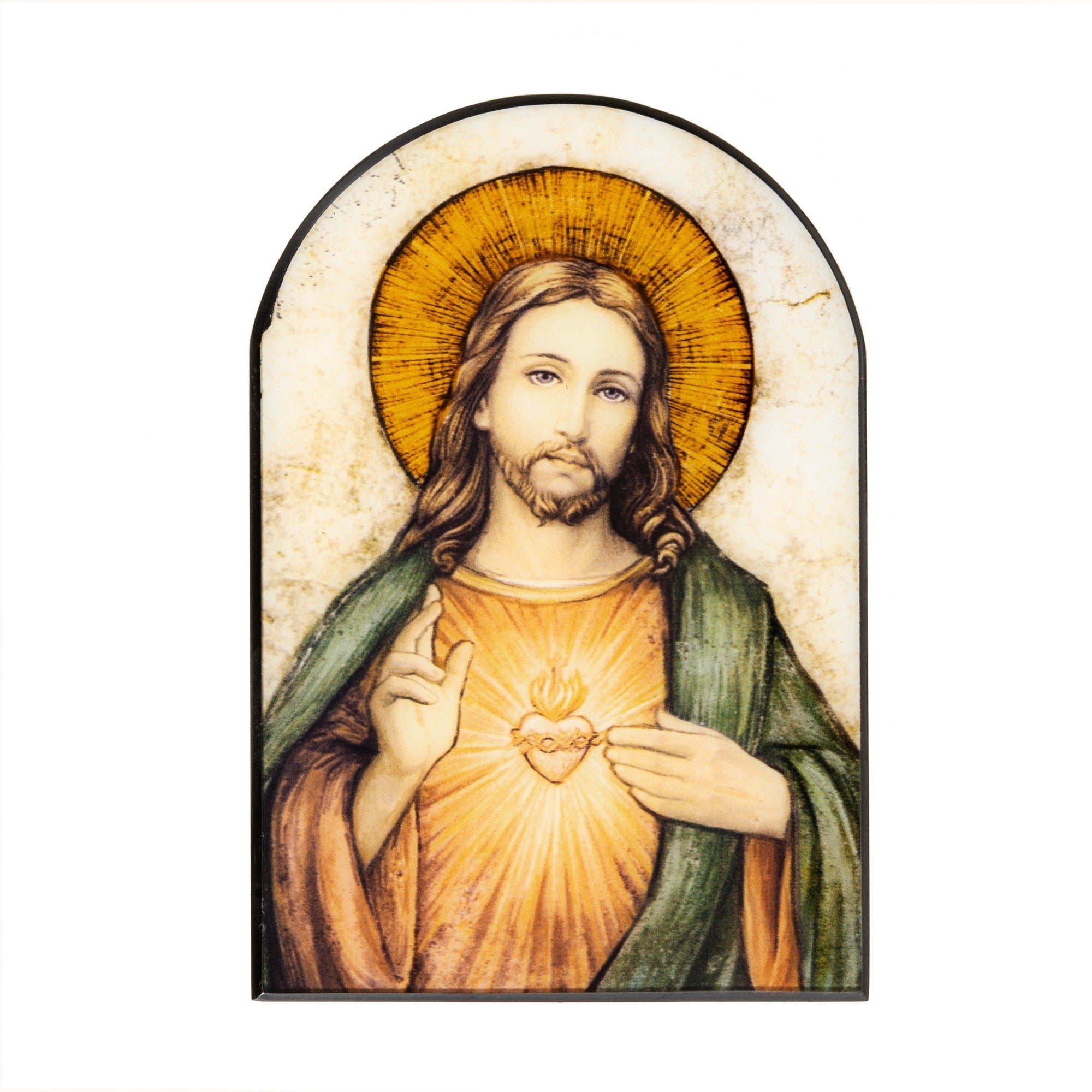 Enhance your home with the Sacred Heart of Jesus decorative arched plaque, featuring a classic yet updated image perfect for today's Catholic home. This colorful wood plaque fosters prayer and devotion, bringing a peaceful tone to any space. At 7" x 5", it's ideal for display on a table or shelf, inviting reflection and prayer in your daily life.