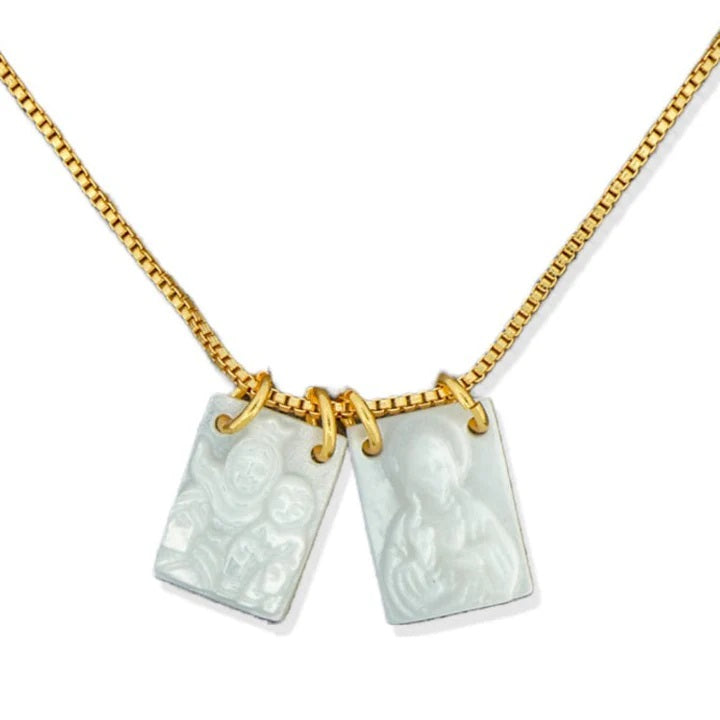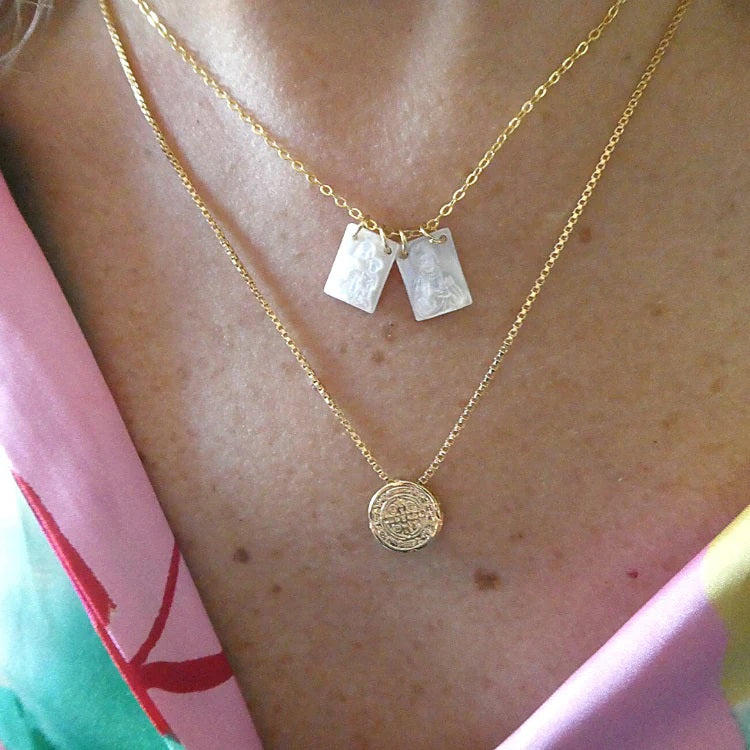 Embrace elegance and faith with this Scapular & St. Benedict Medal Layered Necklace. Featuring a chic, double-strand design, it combines mother of pearl scapular charms with a St. Benedict Jubilee Medal, all in a stunning gold tone. Both versatile and feminine, this necklace offers a stylish layered look in one convenient piece, crafted with care in Brazil.