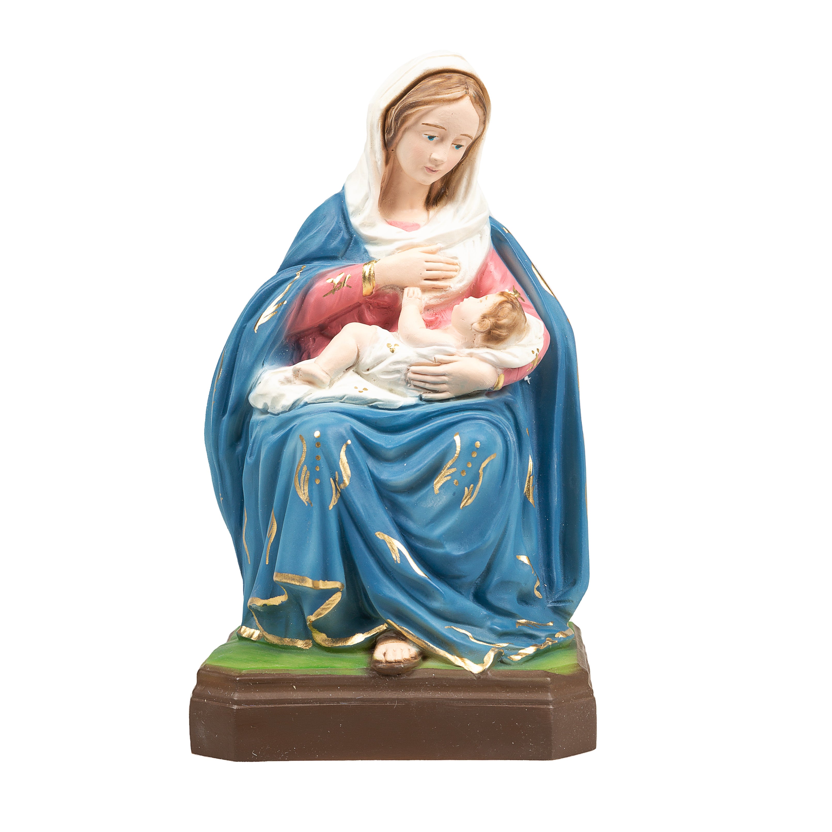 The Seated Our Lady of Grace Statue is a beautifully crafted Italian piece featuring the Madonna and Child. Standing at 8 inches tall, it depicts Mary tenderly cradling the Infant Jesus, with vibrant garments and golden accents. Ideal for sacred spaces, this statue is a heartfelt gift for mothers or devotees. Made of resin in Italy, it's a timeless symbol of love and devotion.