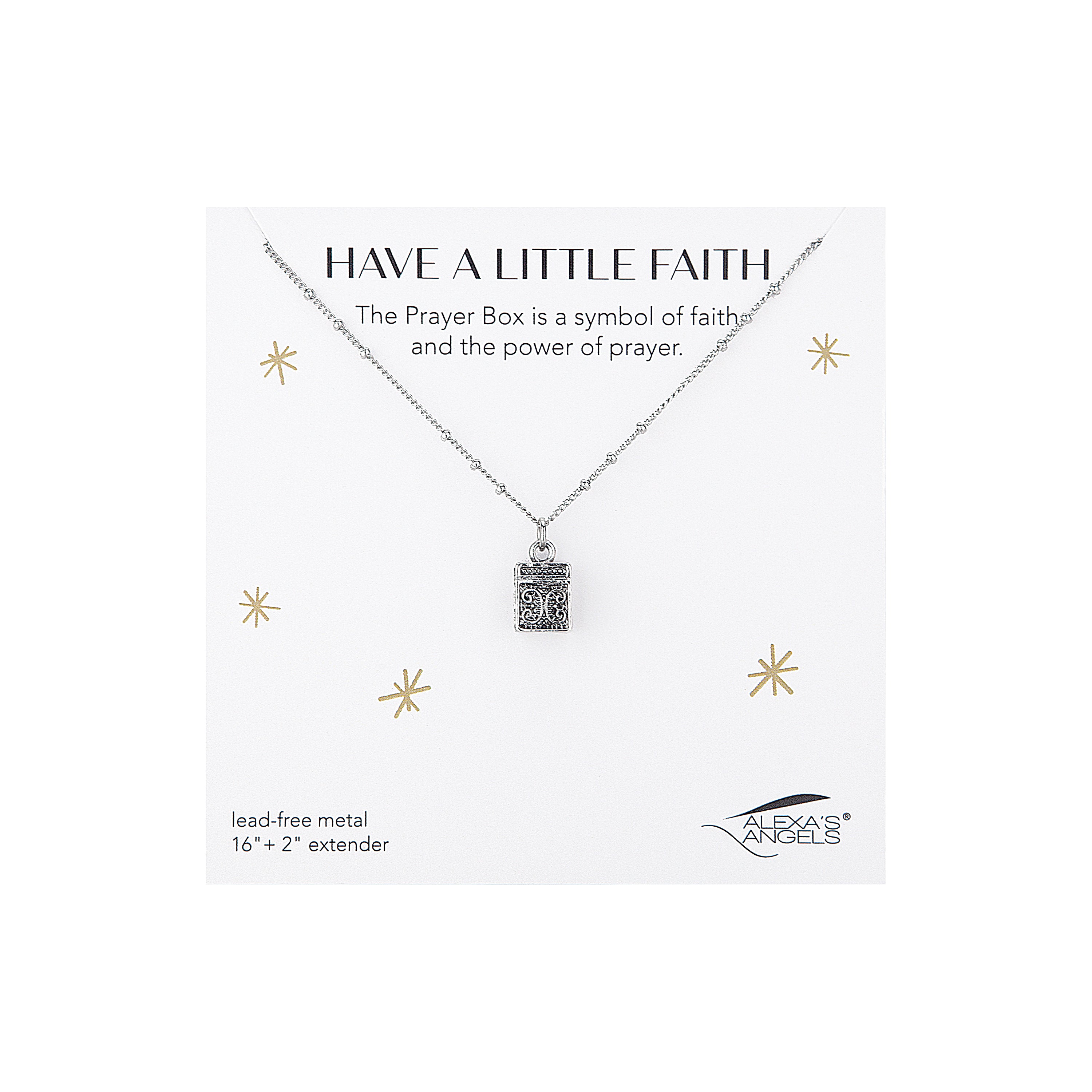 The Silver Prayer Box Necklace features a dainty silver-tone charm on a delicate chain, perfect for holding a prayer, Scripture verse, or message close to your heart. This thoughtful and fashionable piece serves as a faithful expression of encouragement. Complete with a 16" chain and 2" extender, it makes a lovely gift for her and a unique piece of jewelry tradition. Gift boxed for elegance.