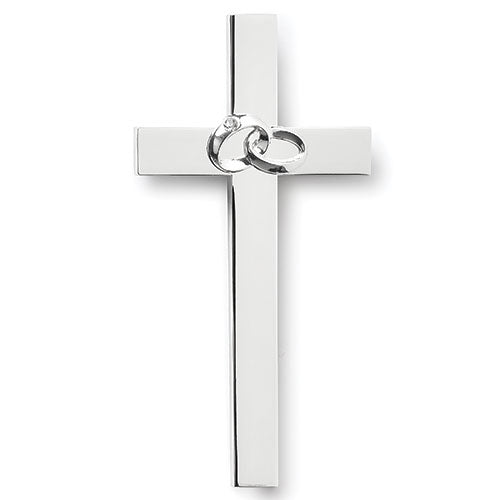 This miniature wall cross in a sleek and charming design features a shining silver finish and two interlocking wedding rings at the center as a sign of the unity and love in the sacrament of Holy Matrimony. The small wall cross is a beautiful sign of your enduring love, and the joining of your lives and souls, as well as the generous gift of God as the source of your union.