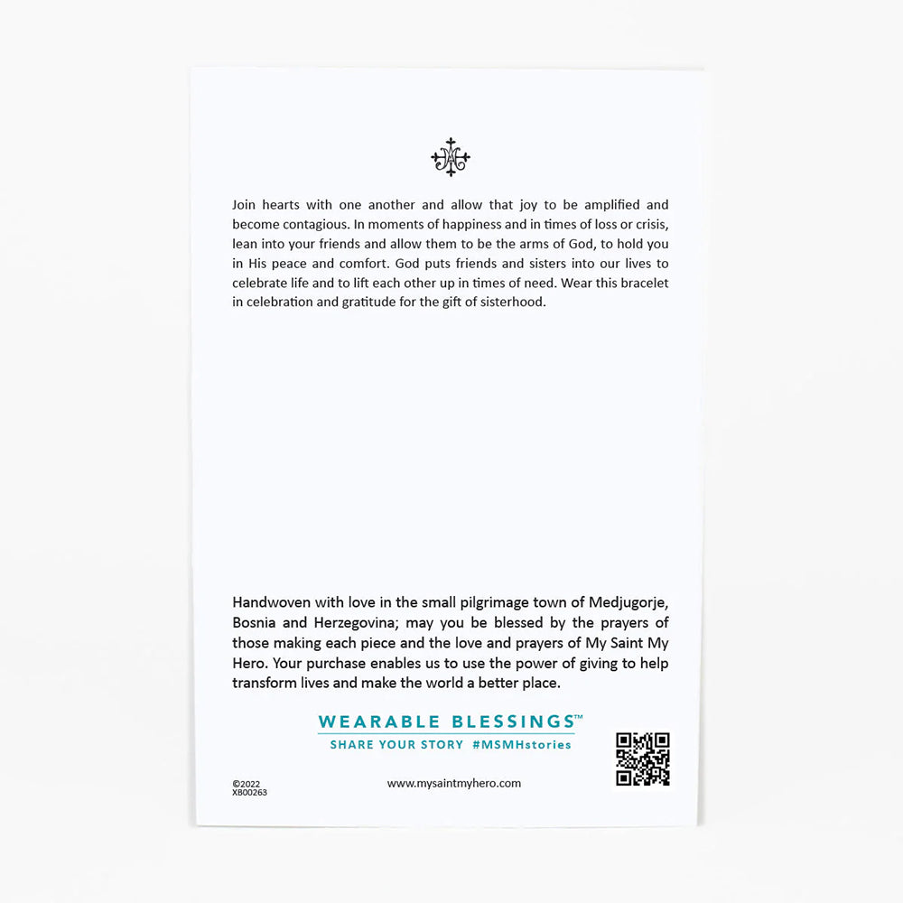 Celebrate the bond of sisterhood with the Sisters of the Heart Bracelet, available in Gold or Silver. Part of the My Saint My Hero Collection, this handwoven bracelet features a puffy heart center, St. Benedict Medal charm, and a "blessed" tag. Perfect for a sister of the heart or in Christ, it comes with a heartfelt message, serving as a cherished reminder of love and friendship.